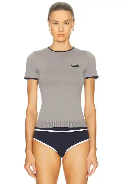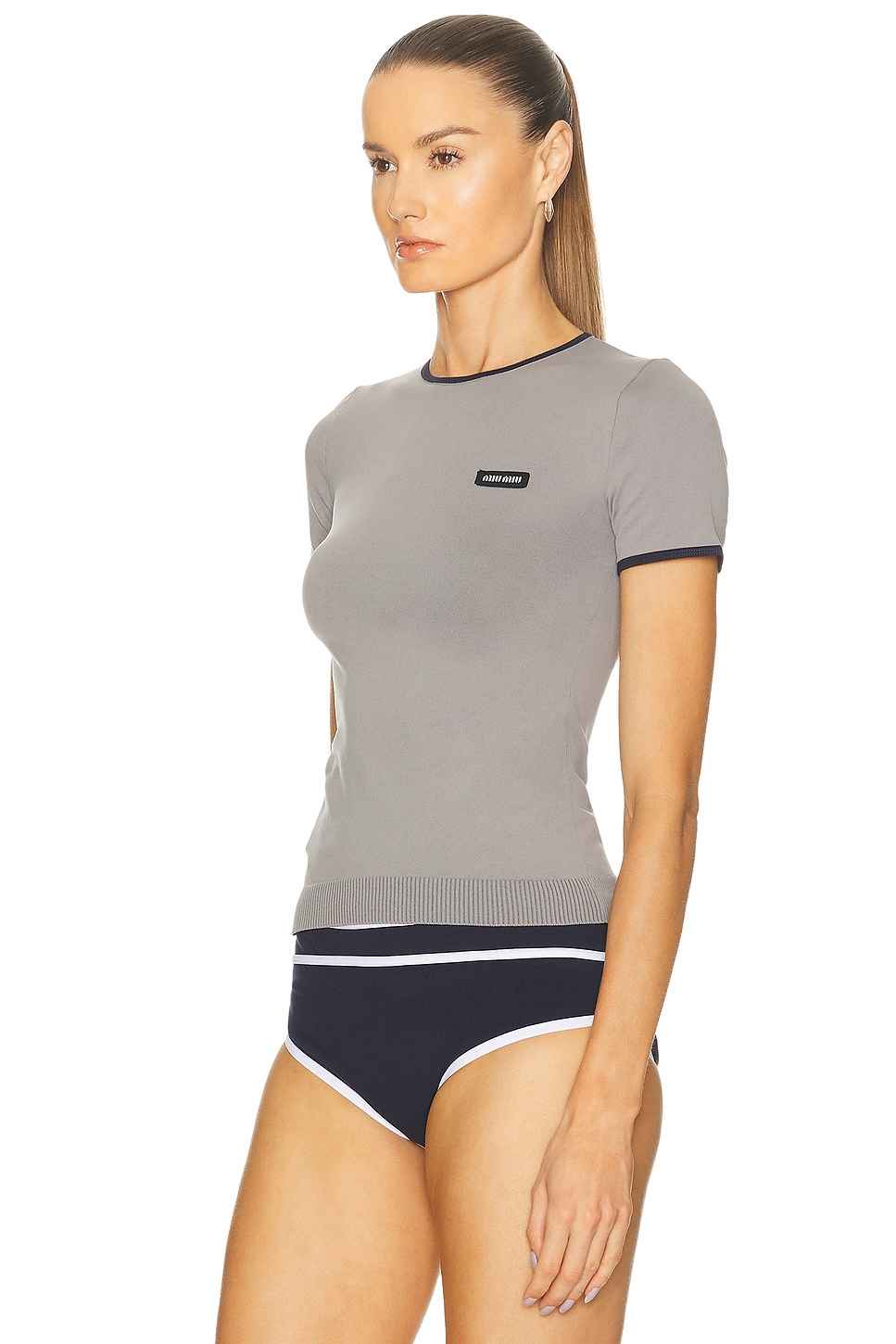 Miu Miu Short Sleeve T-shirt in Grey 67% recycled polyamide 30% polyamide 3% elastane. Hand wash. Pull-on styling. Front embroidered logo patch. Ribbed hem. Lightweight jersey fabric. MIUF-WS189. MMLA88. About the designer: Established in 1992 by Miuccia Prada, Miu Miu reflects fashion forward, ligh...more