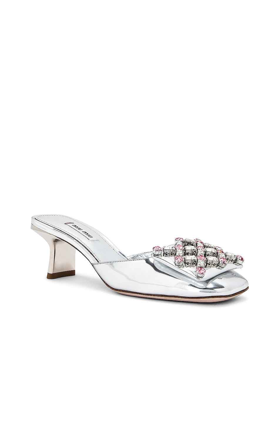 Miu Miu Metallic Sandals in Metallic Silver Metallic leather upper with leather sole. Made in Italy. Crystal embellished plate at toe. Embossed logo detail at heel. Approx 65mm/ 2.5 inch heel. MIUF-WZ70. 5I535D_3LFO_F_055. About the designer: Established in 1992 by Miuccia Prada, Miu Miu reflects fa...more