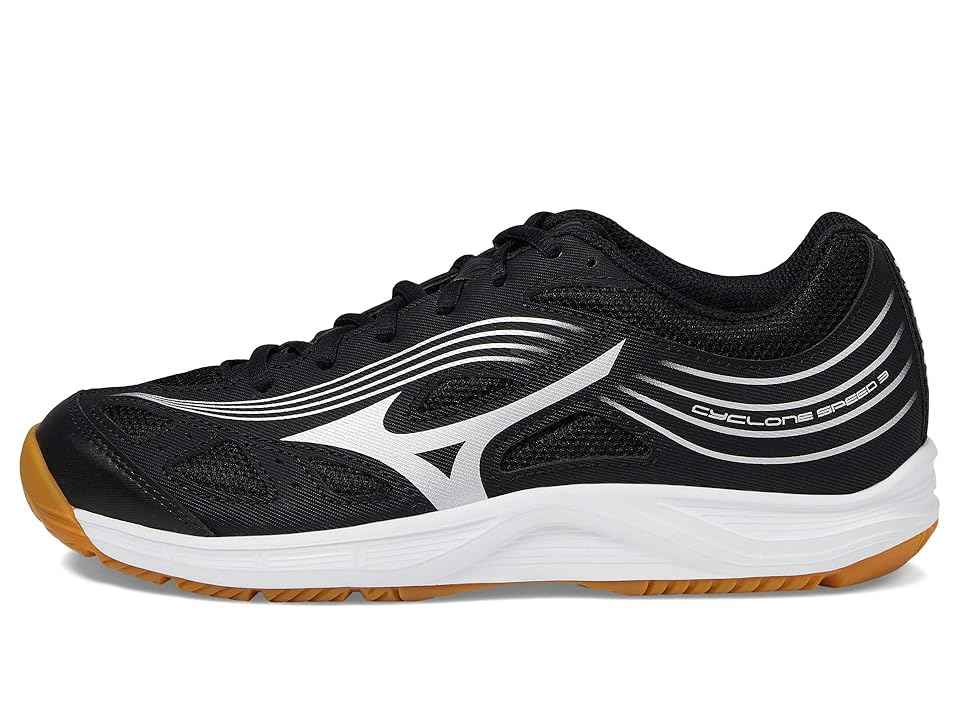 Mizuno Cyclone Speed 3 - Women's Shoes : Black/Silver : The Mizuno Cyclone Speed 3 volleyball shoes have smooth flexural grooves that allow players ideal flexibility for lateral movements on the ground. ; Textile and synthetic upper. ; Textile lining with cushioned removable insole. ; Lace-up closur...more