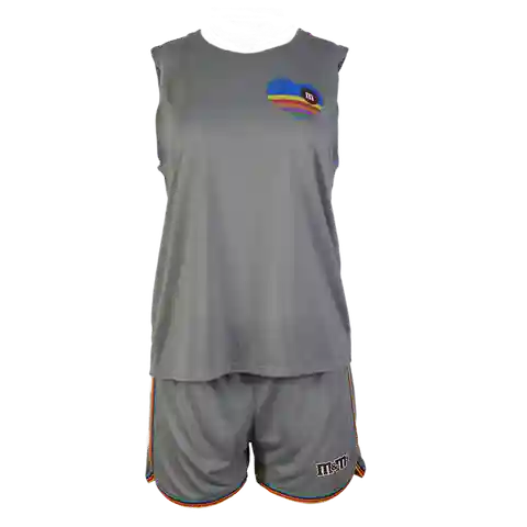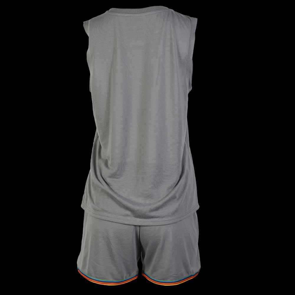 Add a little sweet love to your lounge game. The gray tank top features a rainbow heart on the chest with the m logo and the matching gray shorts have rainbow trim. Comfy and cute, this womens lounge set is perfect for sleeping or hanging around in style.