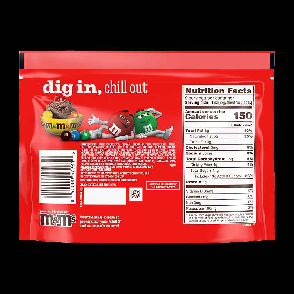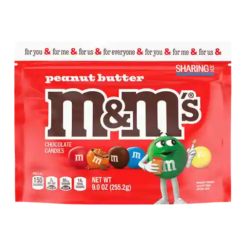 One 9 oz sharing size bag of M&M'S Peanut Butter Chocolate Candy. These popular chocolate candies are made with real peanut butter, milk chocolate and surrounded by a colorful candy shell!