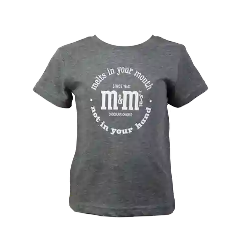 Time to go retro with this nostalgic graphic tee. Our vintage M&MS logo is surrounded by our iconic slogan, melts in your mouth, not in your hand. Available in toddler, youth, mens, and womens sizes, the soft heather gray t-shirt is a fun gift for all your friends and family.