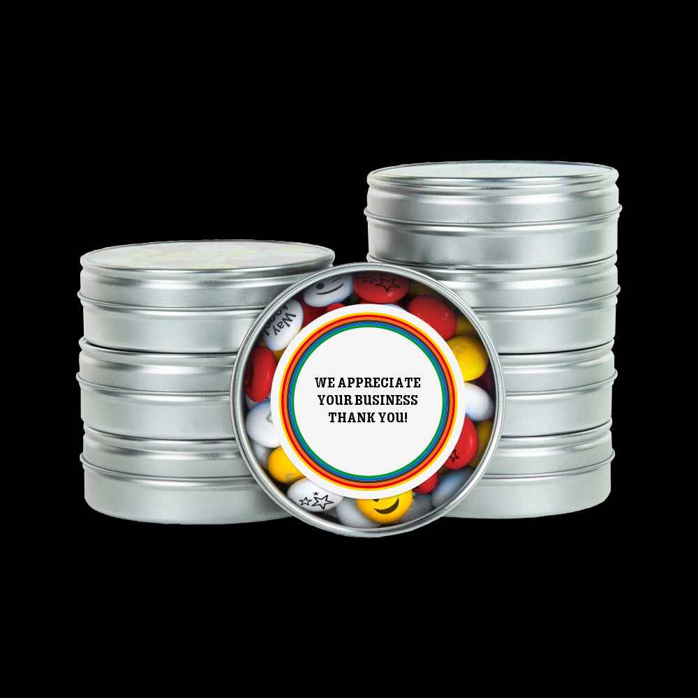 Share your corporate message (and some candy) with these sweet favors customized inside and out. The silver tins are ideal for client or employee gifts, corporate parties, tradeshows, or other business events. The lid includes a custom message and is partly transparent showing off the personalized M...more