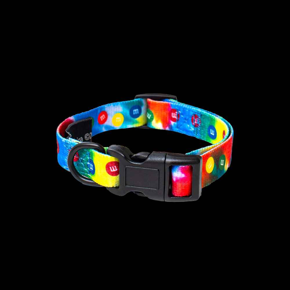 Help your furry friends show off their groovy side with this fun and funky M&MS Tie-Dye Pet Collar. The colorful pattern with secure black buckle comes in small, medium, and large to fit cats and most canine companions