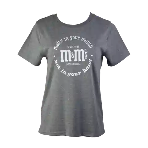 Time to go retro with this nostalgic graphic tee. Our vintage M&MS logo is surrounded by our iconic slogan, melts in your mouth, not in your hand. Available in toddler, youth, mens, and womens sizes, the soft heather gray t-shirt is a fun gift for all your friends and family.
