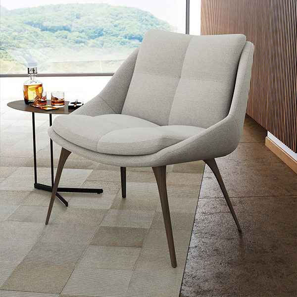 With its refined formal or casual form, the Columbus Lounge Chair is as comfortable as it is intriguing. Tufting and cross-stitching on both the back- and seat- cushion provide subtle yet luxurious accenting. Below, angular steel legs feature rich wood veneer while the inside of the legs are matte p...more