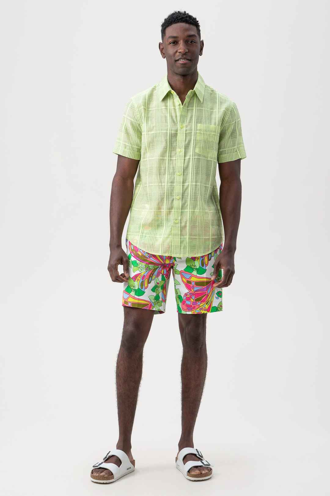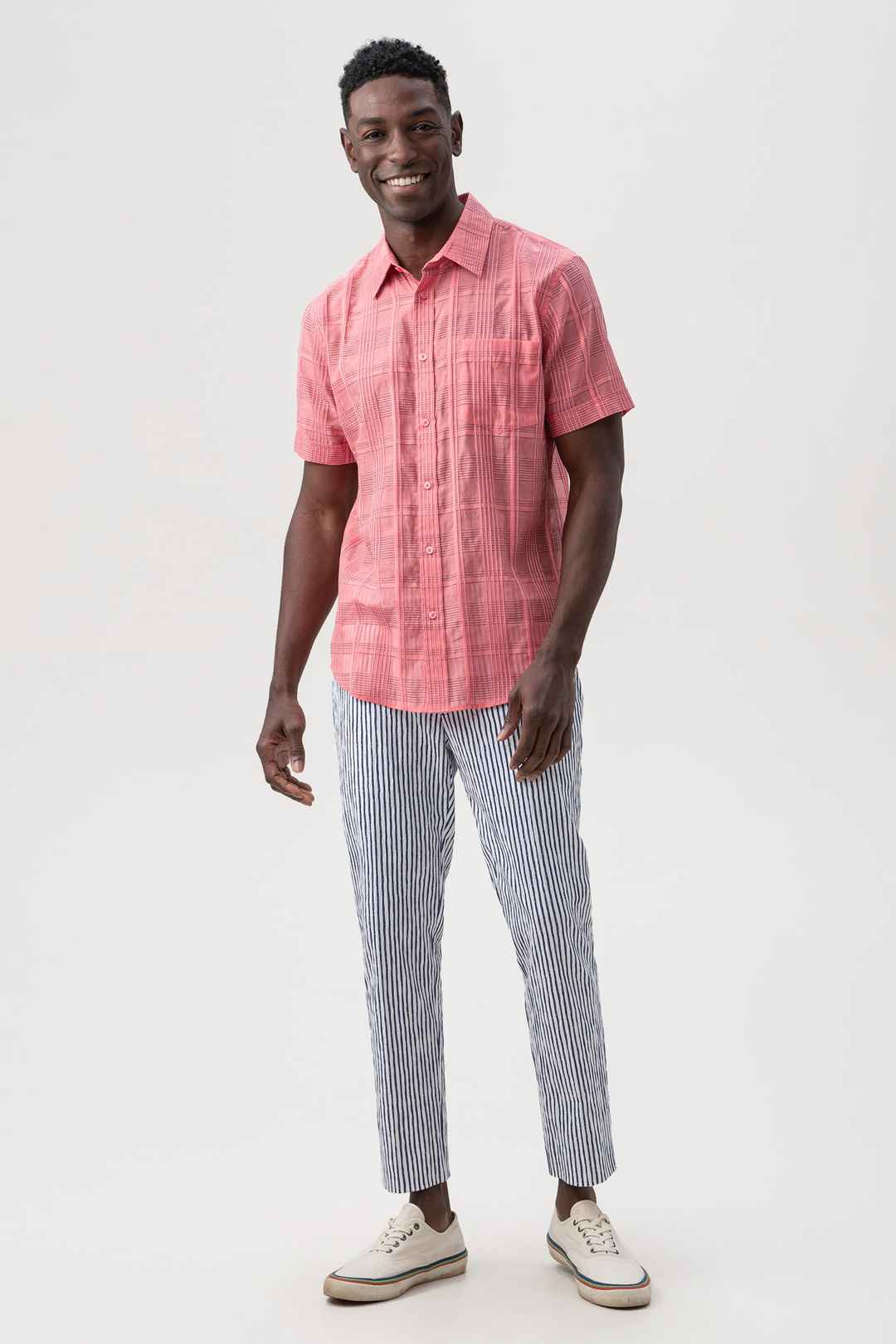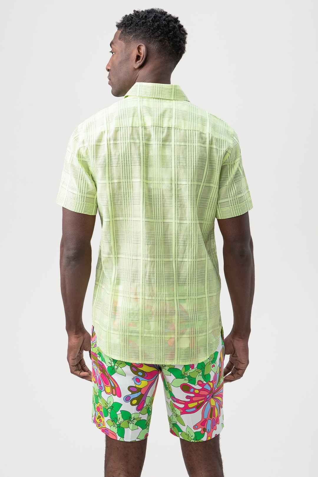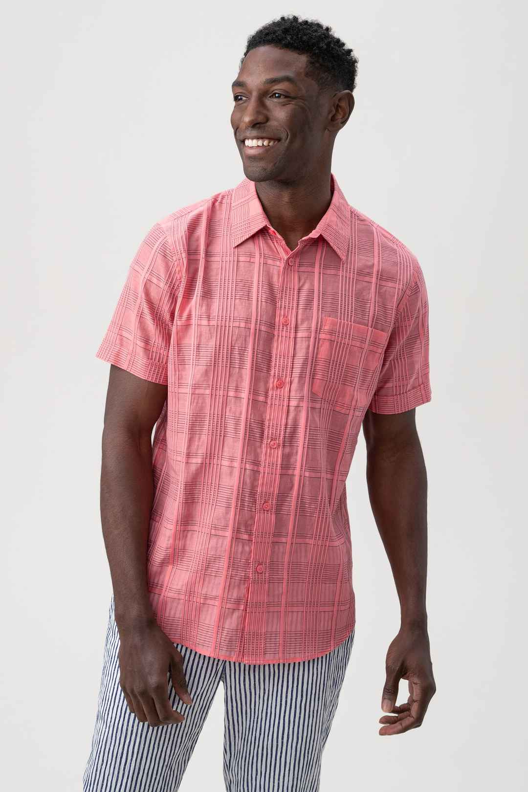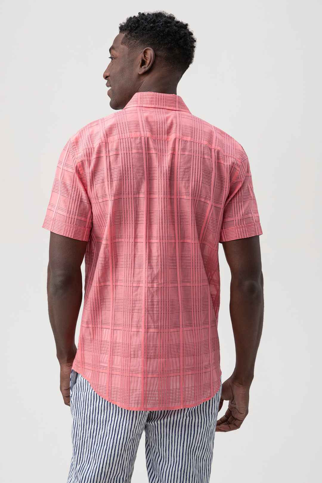 A fresh new print is here in our timeless, short-sleeve button-up with a slim fit and traditional collar. This effortless shirt is the perfect choice for a getaway or every day. Collar; Full button front; Slim fit; Front patch pocket; Short sleeves; FABRIC:Cotton Check Organdy Shirting 87% Cotto...more
