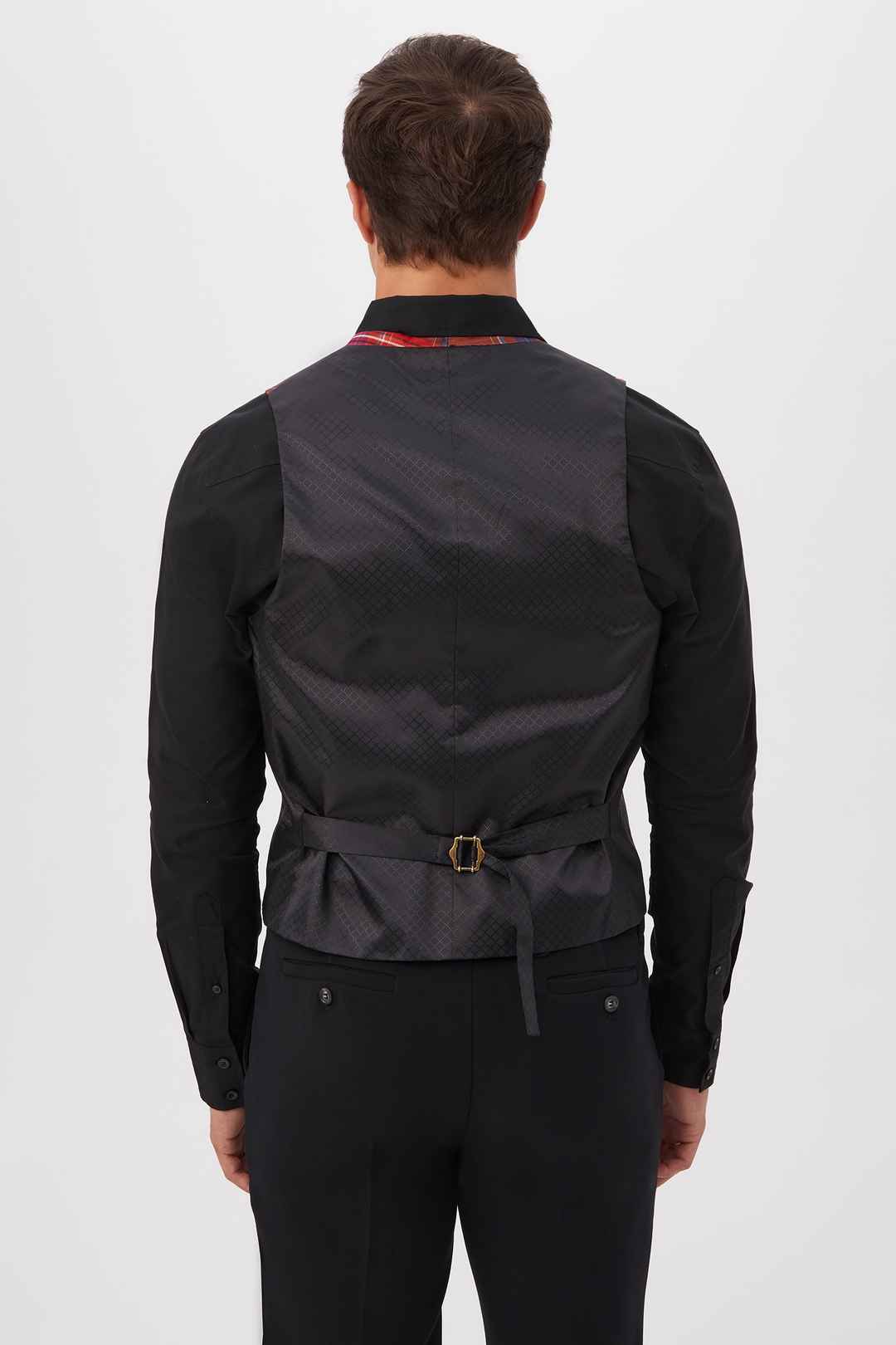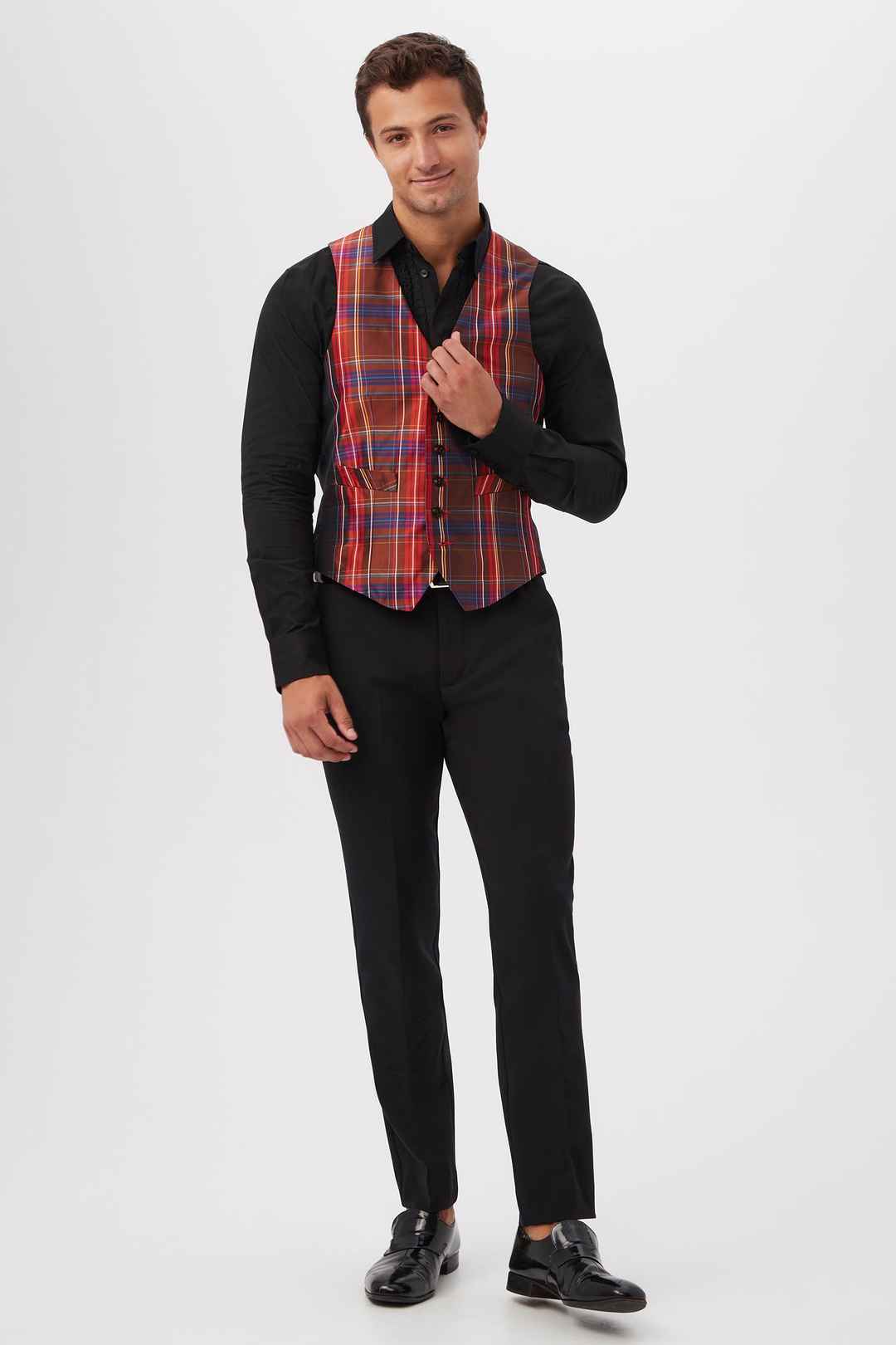 Finish your look on a dashing note with this classic vest in a bold new plaid. Featuring slim tailoring and a button front, this sleek plaid vest pairs perfectly with our matching plaid blazer and trousers for a classic three-piece look. Tailored fit; Sleeveless; Front buttons; Adjustable back bu...more