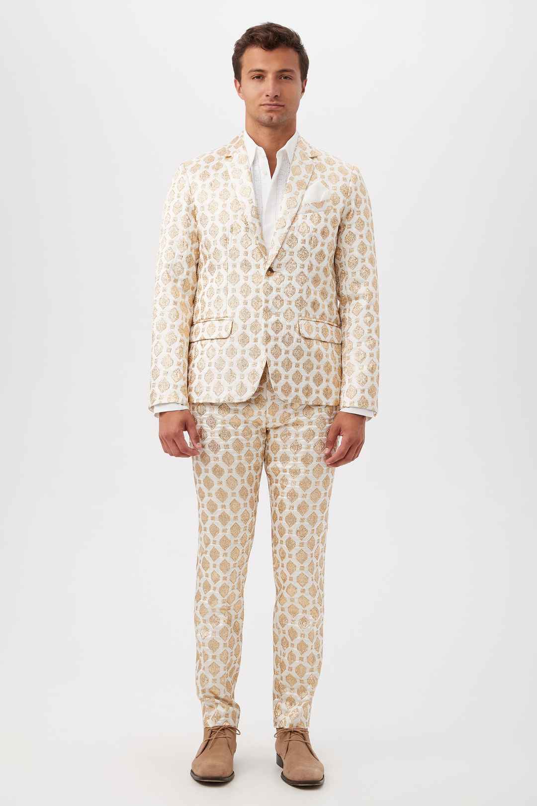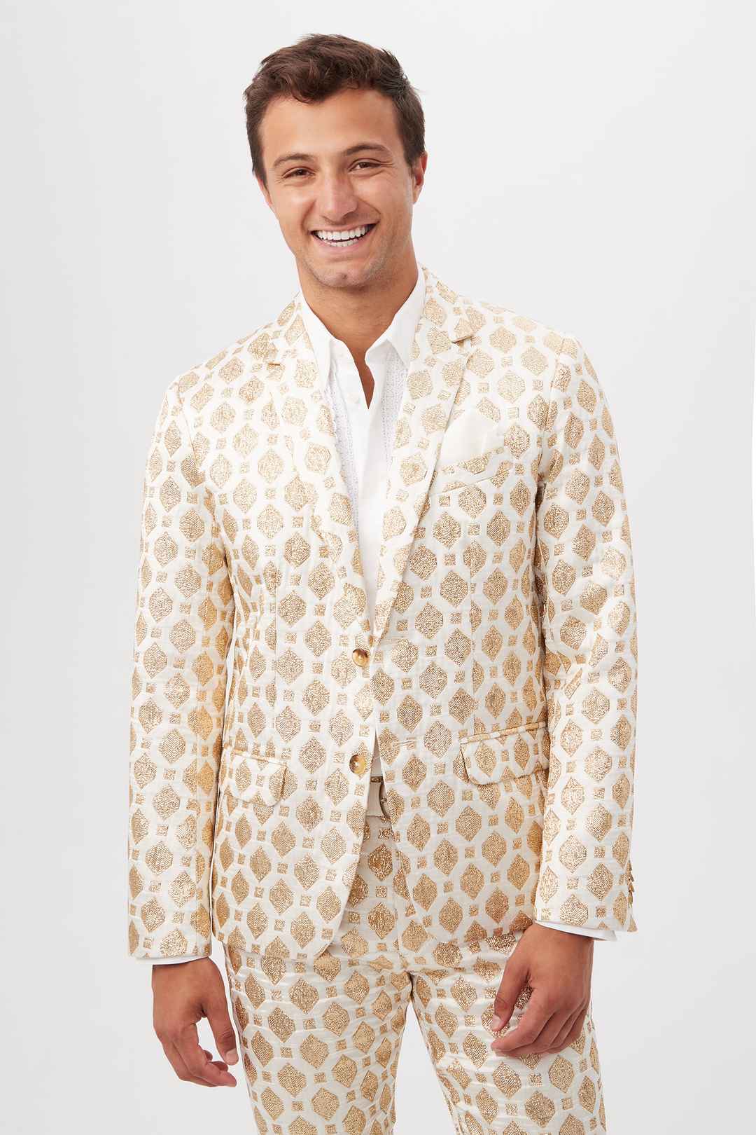 In our best-selling fit, this tailored men's blazer is updated for the season in refined white and gold jacquard for effortless sophistication. Pair this luxe, jacquard blazer with our matching pants for a complete look. Notch lapel; Long sleeves; Front flap pockets; inside welt pocket; Single-br...more