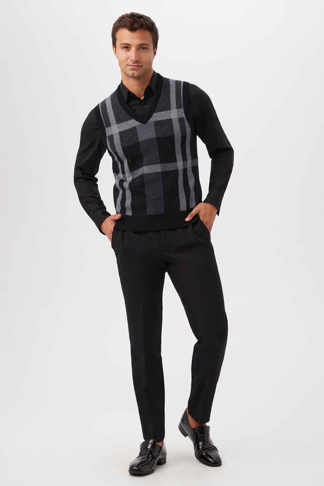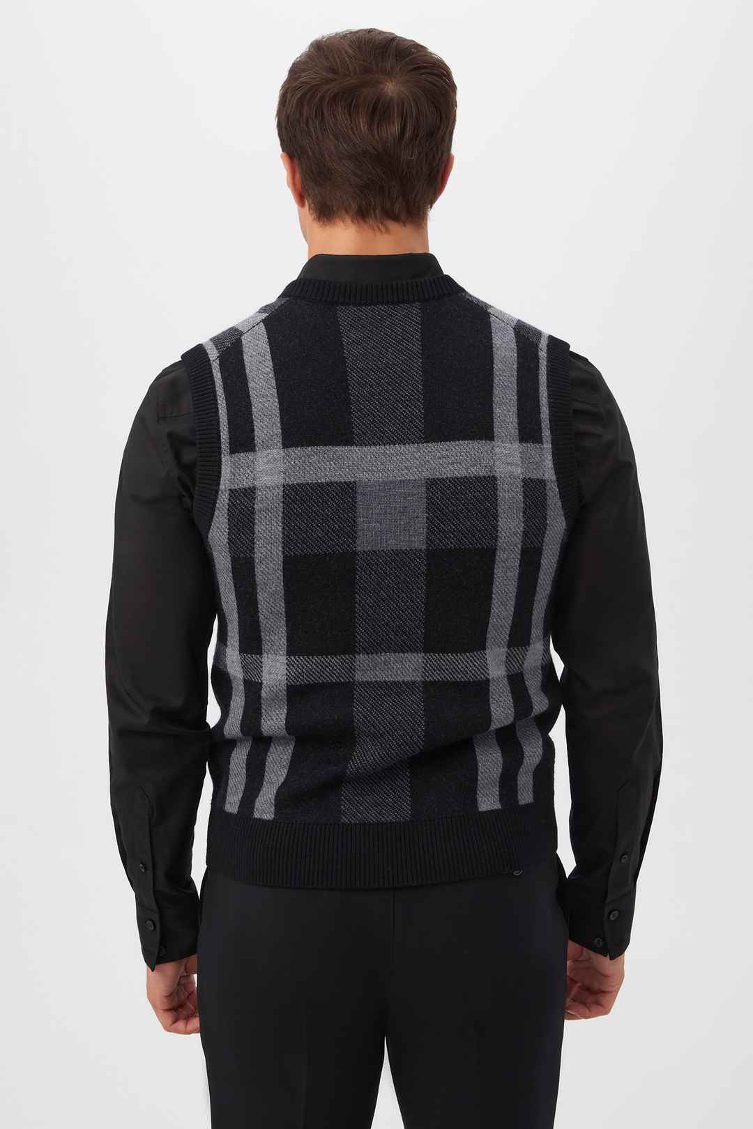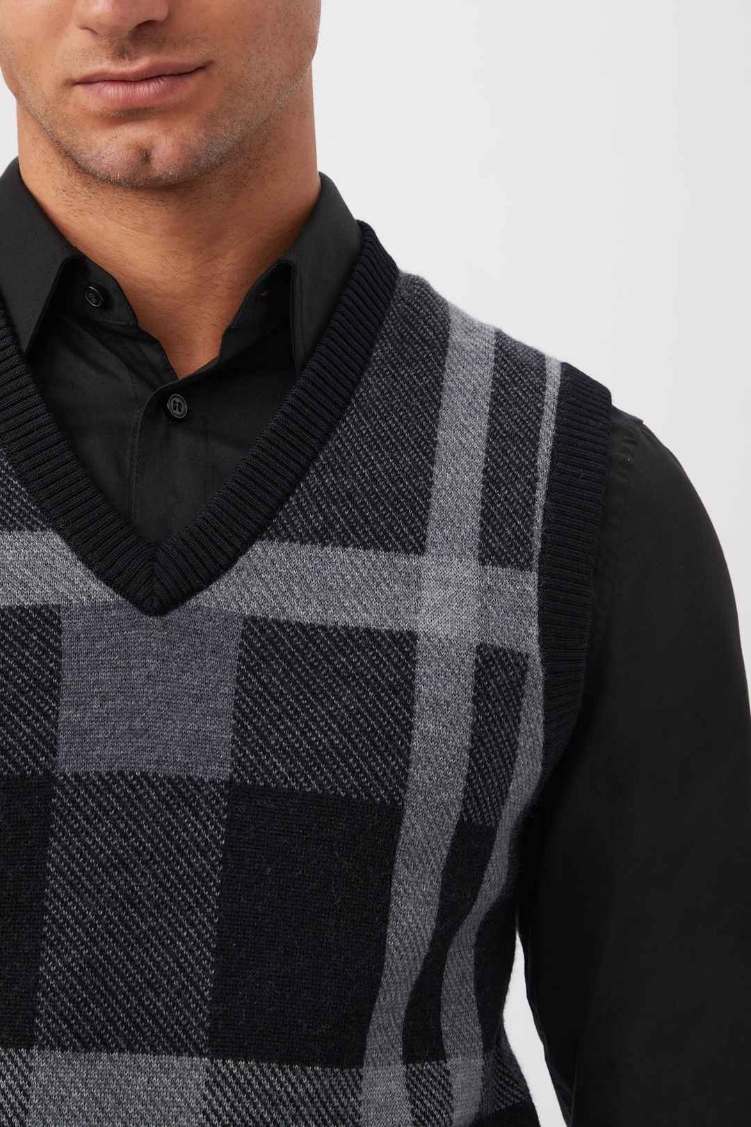 This sleeveless, Merino wool sweater vest blends classic styling with cozy comfort. For dressed-up events or workday attire, this Merino wool sweater vest is the perfect complement to your cool-weather wardrobe. V-neckline; Sleeveless; Monochromatic plaid design; Pullover-style; Ribbed neck, sle...more