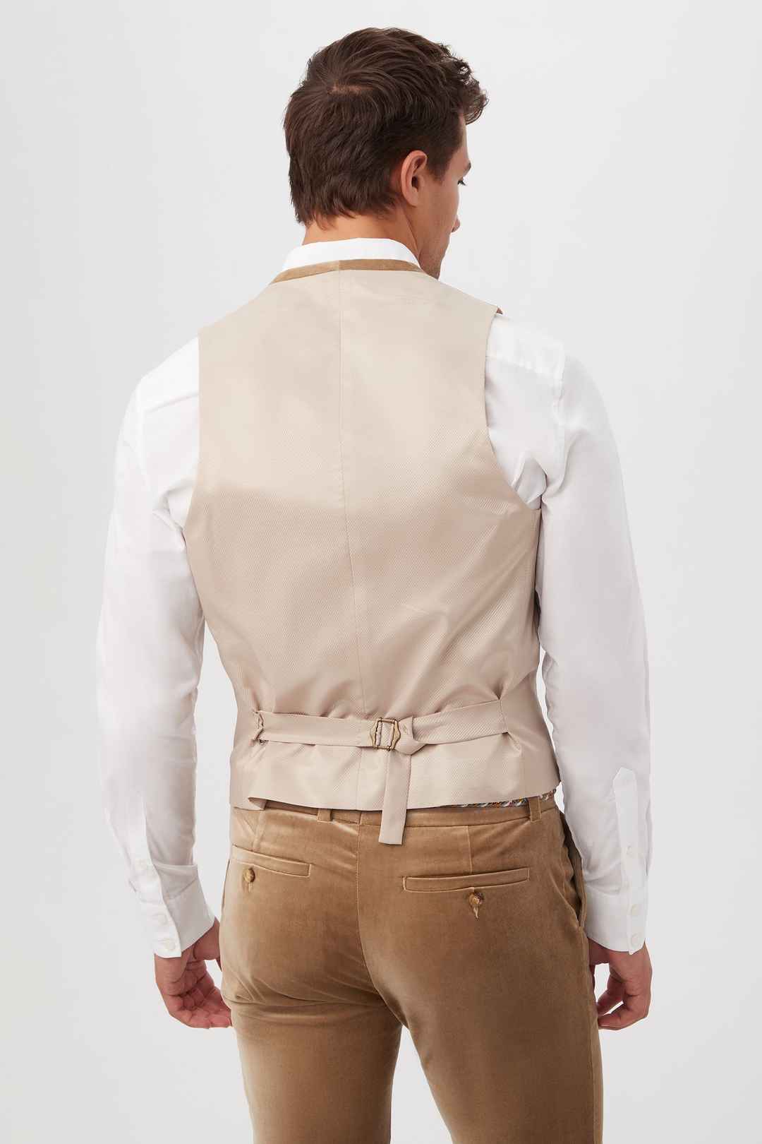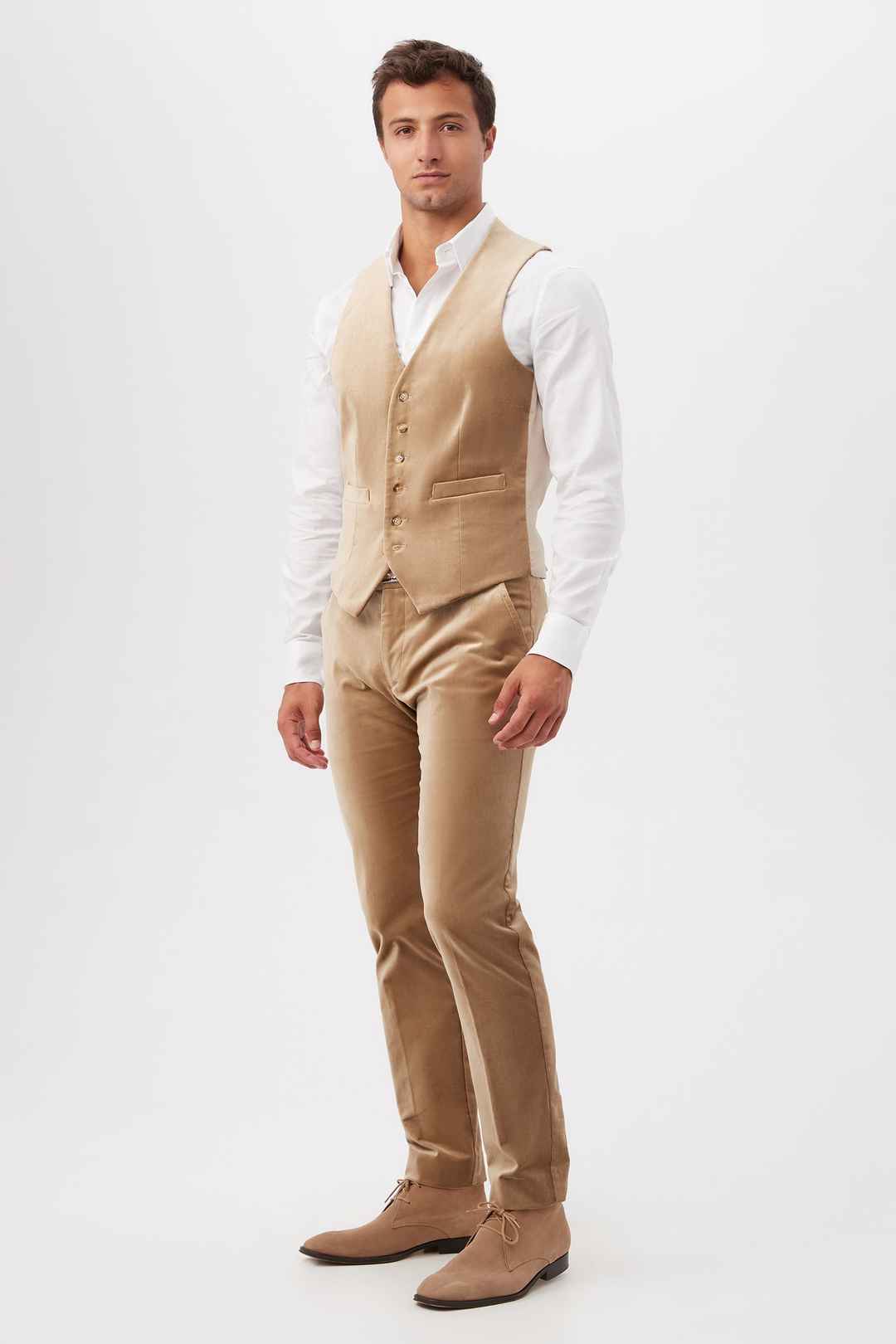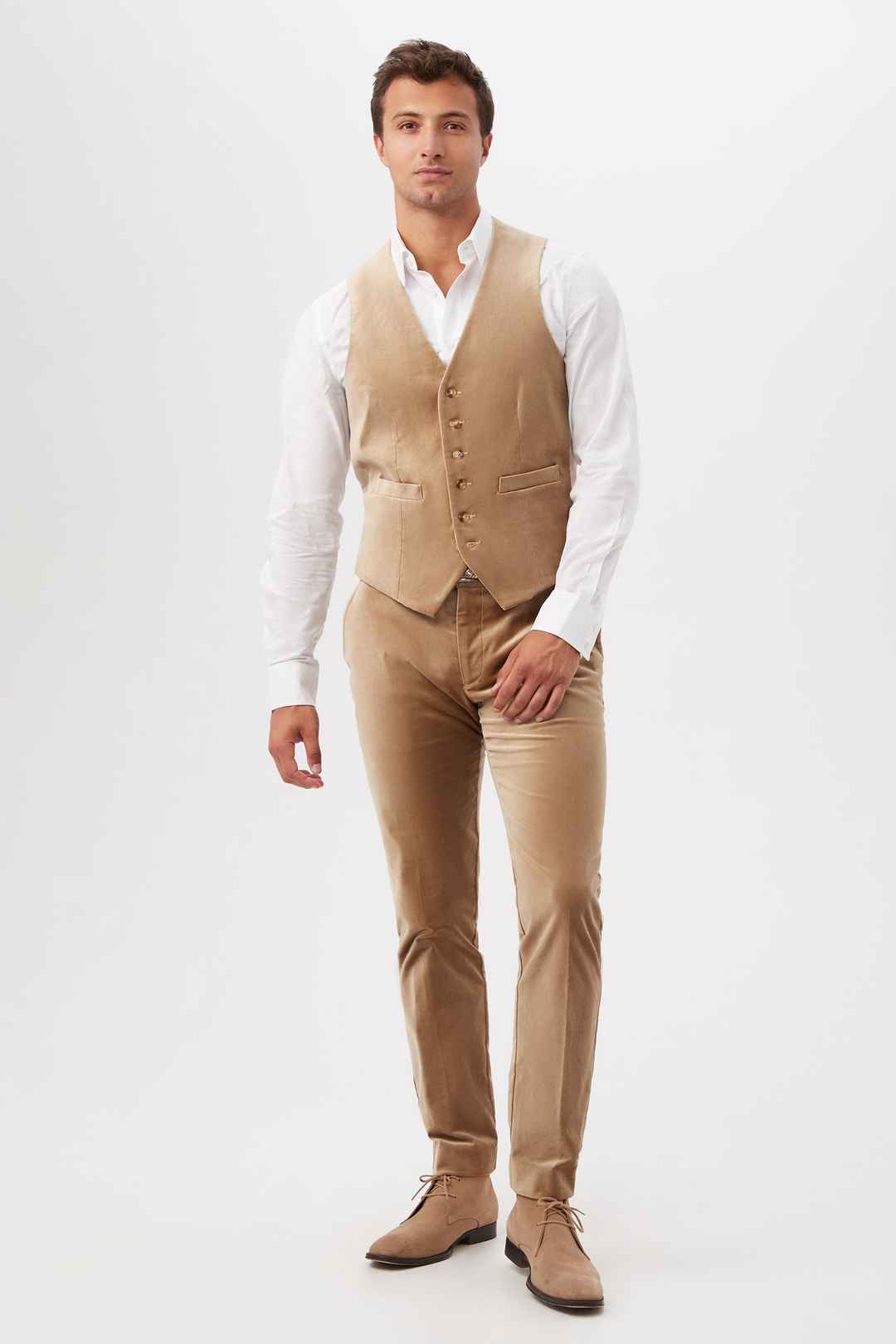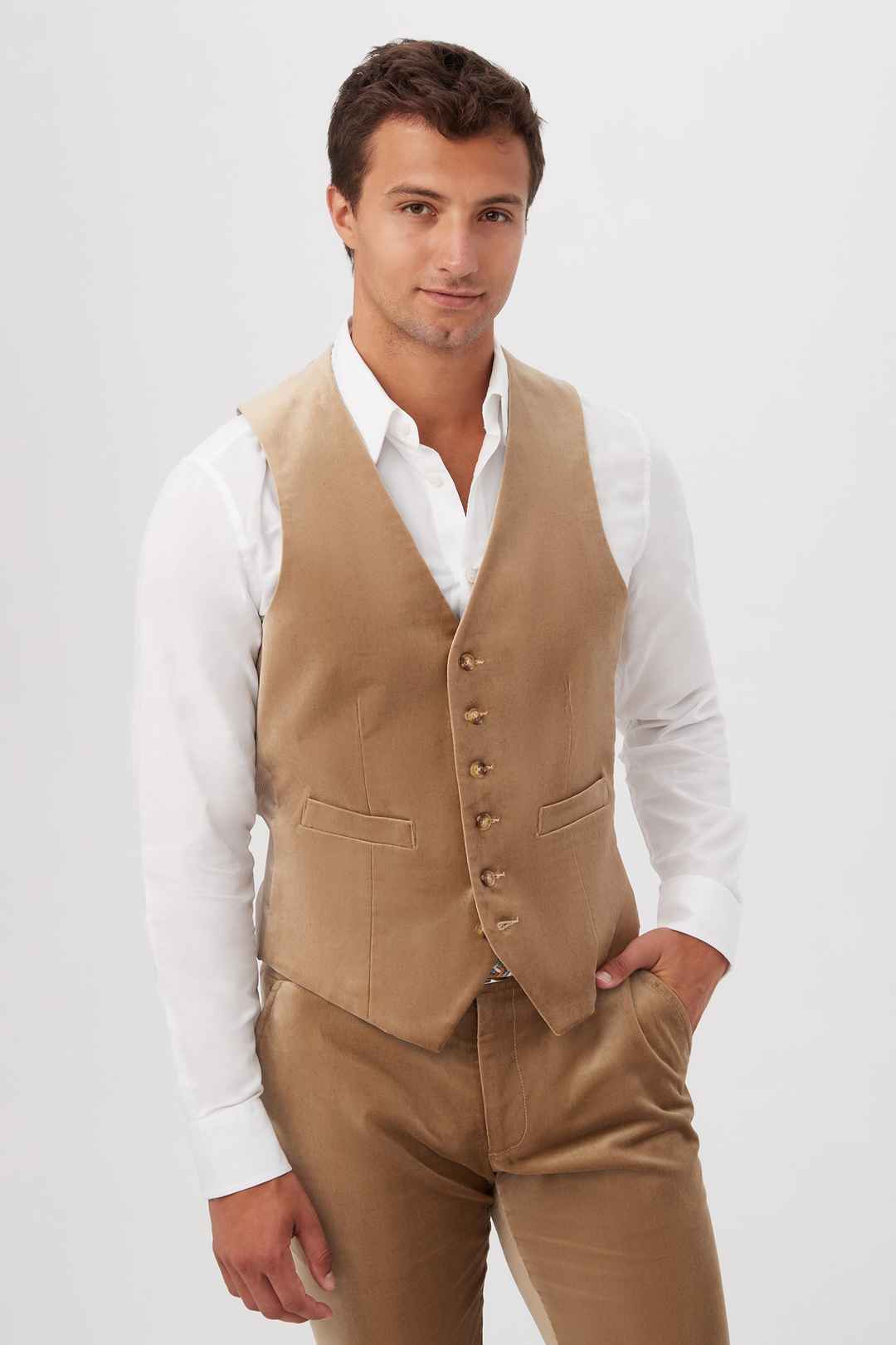 Finish your look on a dashing note with our classic men's vest in soft, stretch velveteen. Featuring slim tailoring and a button front, this velveteen vest adds elegant style to any look. Pair this gold vest with our matching blazer and trousers for a classic three-piece look. Tailored fit; Sleevel...more