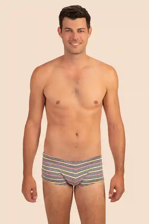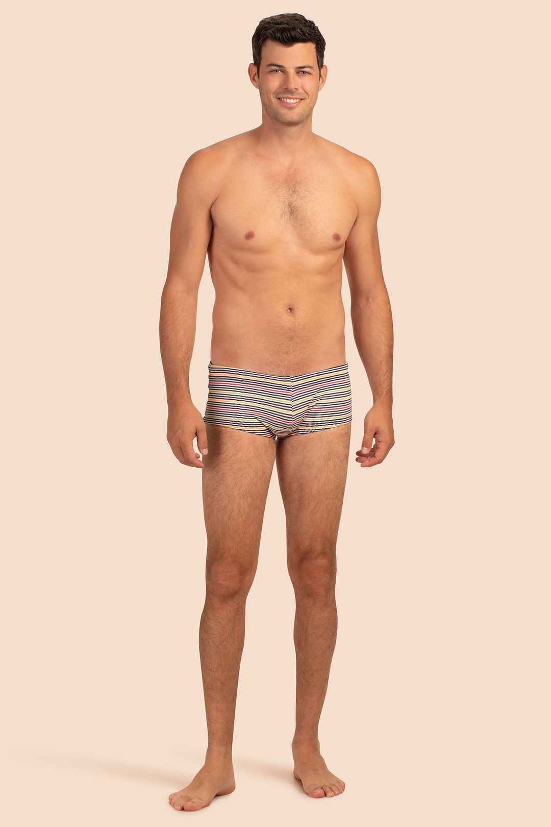 Vacation-ready and versatile, these striped swim shorts feature classic horizontal stripes and textured jacquard to instantly elevate your swim style. A fun new addition to your swim wardrobe, these men's swim shorts are ready for any adventure. Adjustable, inner drawstring; Fitted; Underseam: 3.7...more