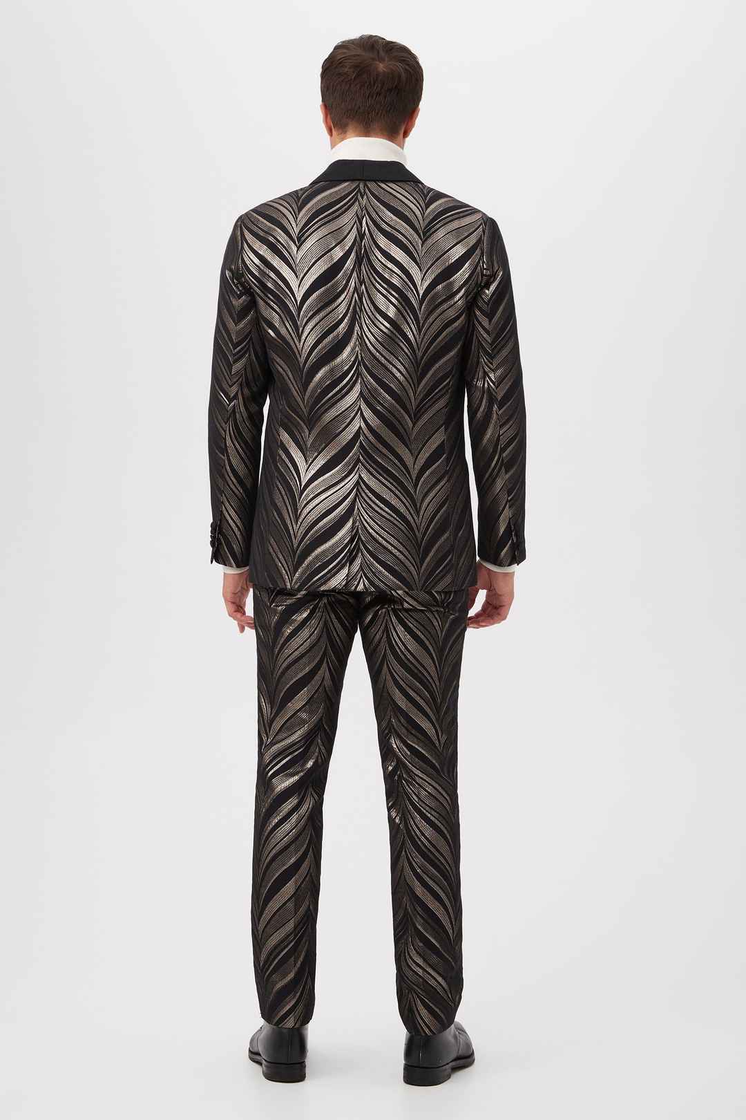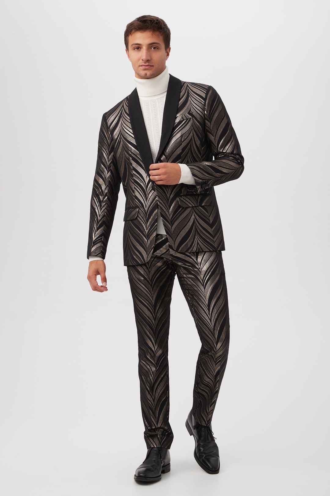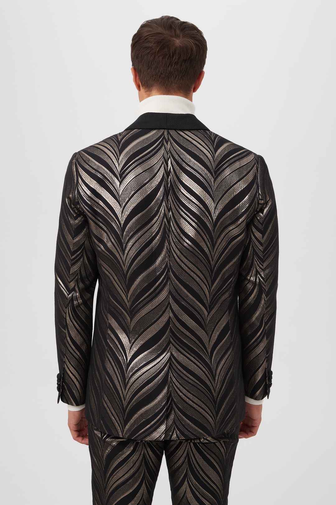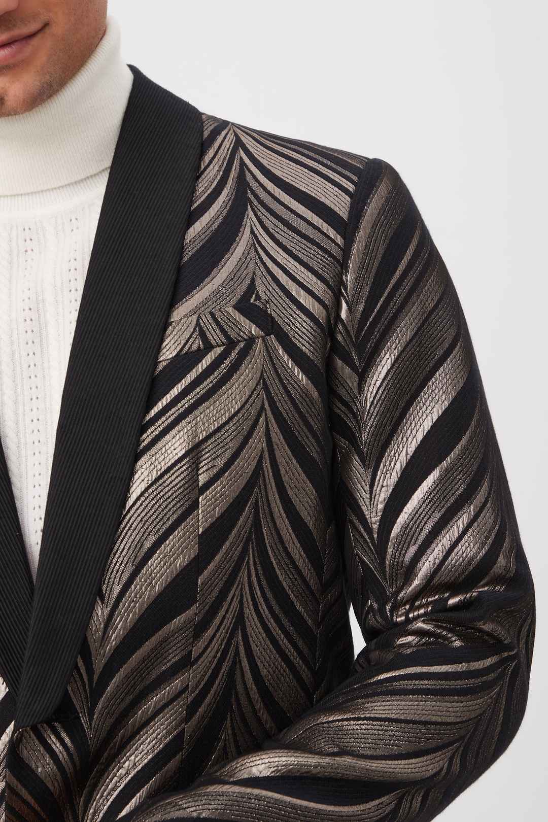 This bold metallic blazer is ready for event season in bold, Chevron Jacquard in black and silver. With a contrast shawl lapel and front welt pockets, this tux blazer is the perfect choice for making an entrance at your next event. Contrasting shawl lapel; Long sleeves; Front welt pockets; Single...more