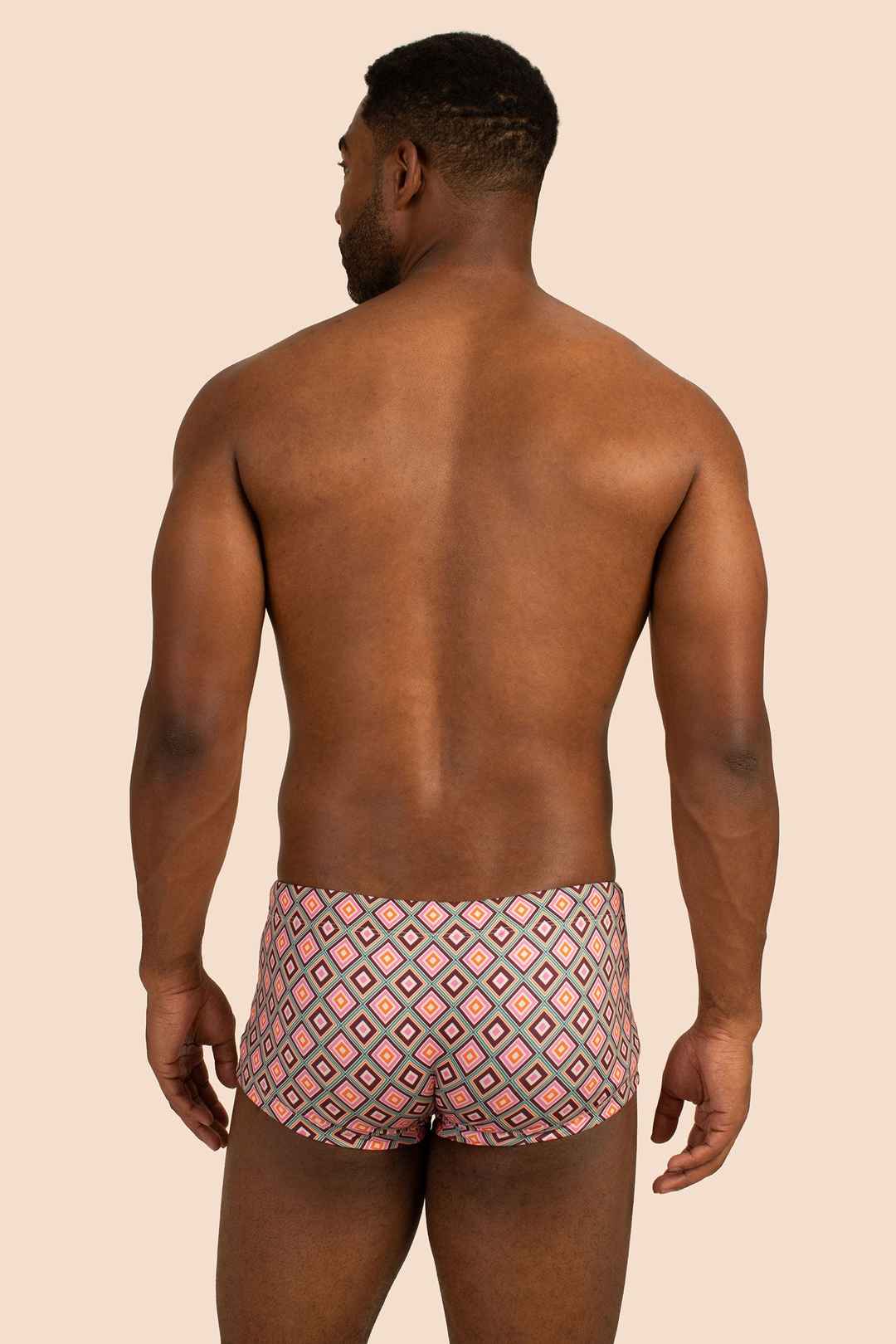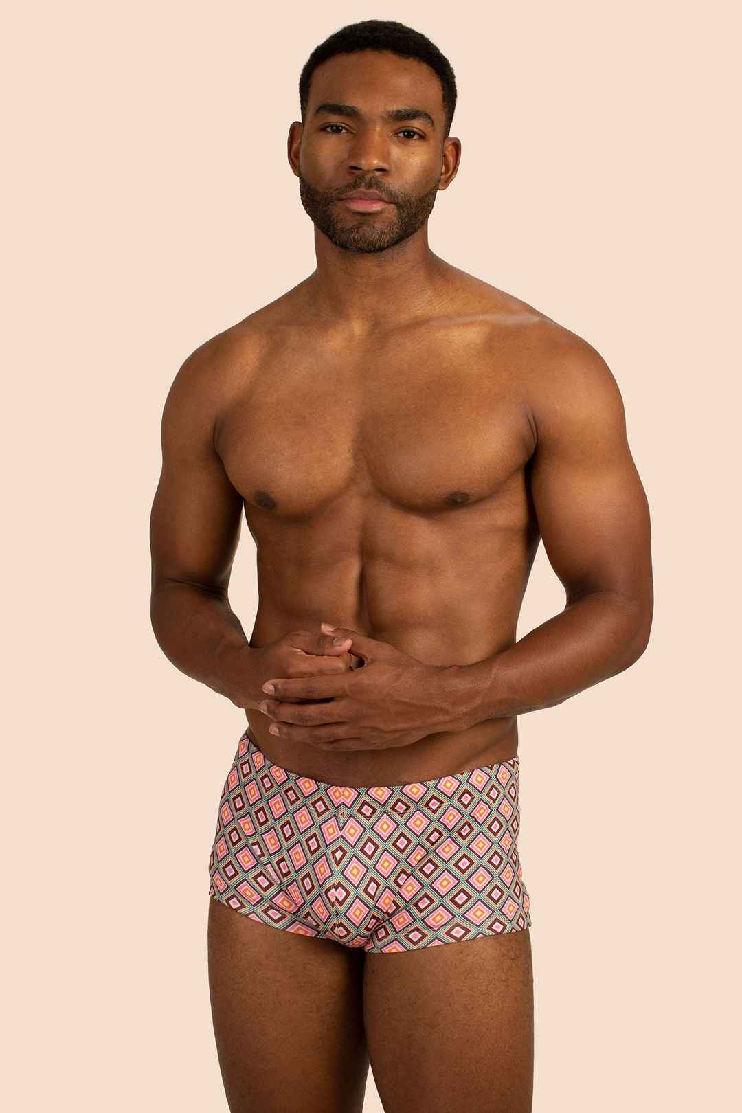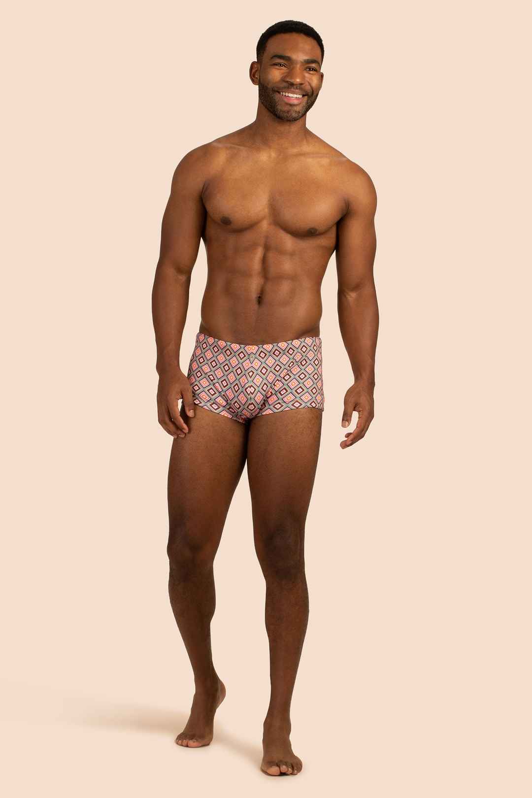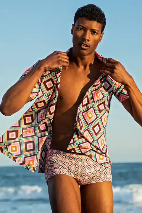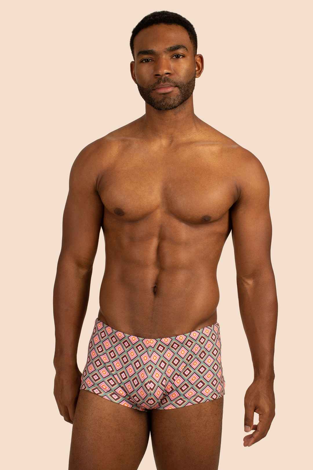 These fitted swim shorts are the perfect choice when you want a swim brief with a little more coverage. Update your swim collection with this new swim trunk in a bold new print. Pair with a caftan for your next holiday in the sun. Elastic waist; Fitted; Front rise: 6.25"; Made in California; FABR...more