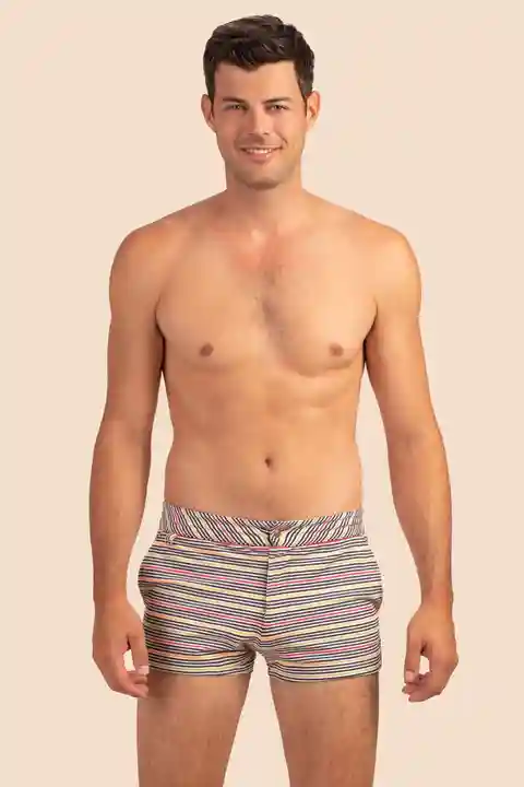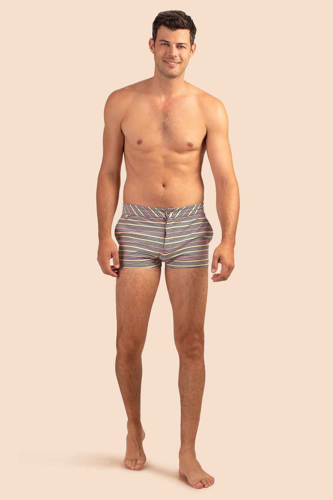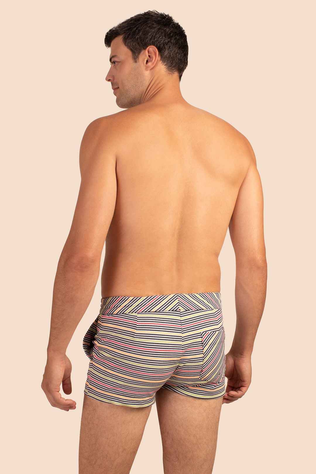 Elevated and modern, this striped swim short features muted pink, grey, and yellow stripes, side pockets, and textured jacquard knit for an instant fabric upgrade. Pair this striped swim trunk with a caftan for beach-ready style. Slim fit; Side pockets; Snap and zip closure; Inseam: 2"; Made in ...more