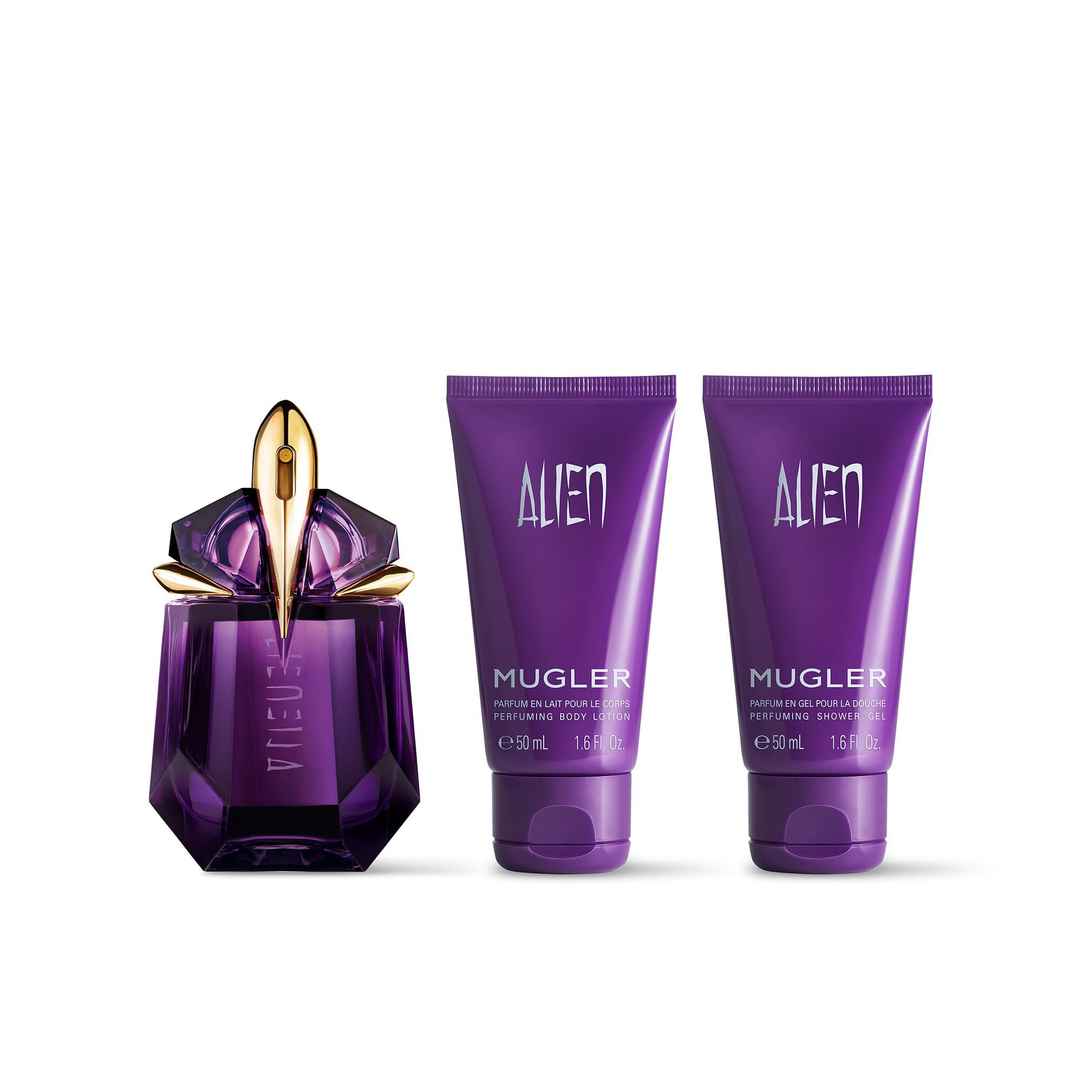 \t \tFragrance Family: Amber Woody Key Notes: Jasmin Sambac, Cashmeran, White Amber About the Fragrance: Say I love you in three ways when you give the gift of Muglers alien eau de parfum luxury trio. This three-pieces amber woody fragrance gift set presents the classic edp in three forms. Incorpora...more