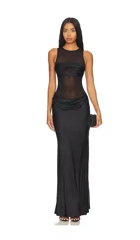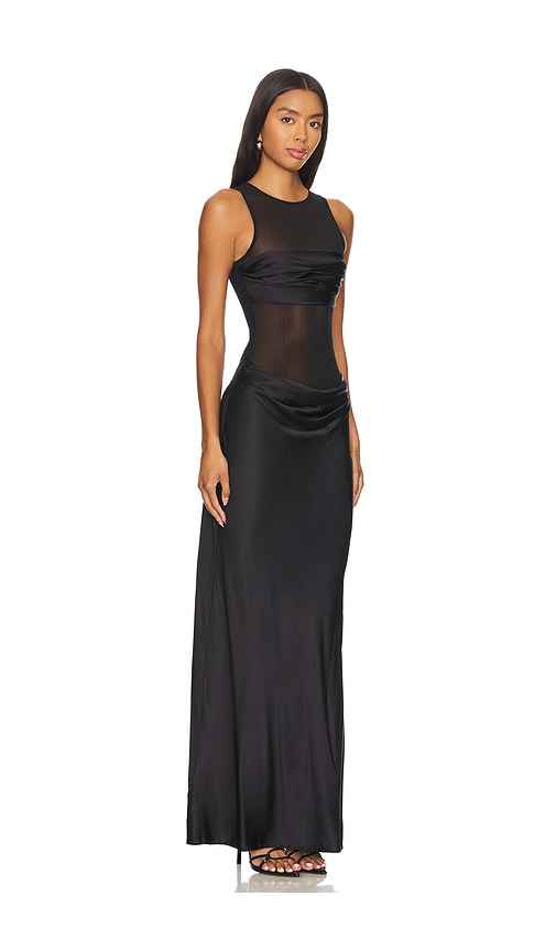 NBD Fiza Maxi Dress in Black. - size L (also in XL) NBD Fiza Maxi Dress in Black. - size L (also in XL) Self: 95% polyester 5% elastane Contrast: 97% viscose 3% elastane. Made in China. Dry clean only. Unlined. Hidden back zipper closure and snap gusset. Mesh fabric with satin panels at bust and ski...more