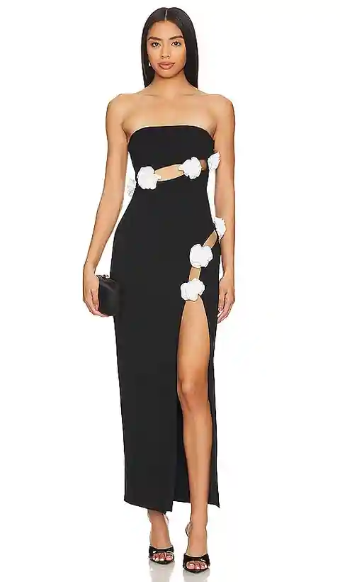 NBD Alden Maxi Dress in Black. - size L (also in M, S, XS) NBD Alden Maxi Dress in Black. - size L (also in M, S, XS) Flaunt your style at your next formal affair with the NBD Alden Maxi Dress in Black. This strapless sensation features alluring cut-out details and delicate floral embellishments, ex...more