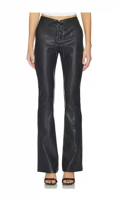 NBD Annalise Pant in Black. - size L (also in M, S, XL, XS, XXS) NBD Annalise Pant in Black. - size L (also in M, S, XL, XS, XXS) Face: 100% polyurethane Back: 100% polyester. Made in China. Hand wash cold. Hidden back zip with hook and eye closure. Lightweight faux leather fabric. Front lace-up tie...more