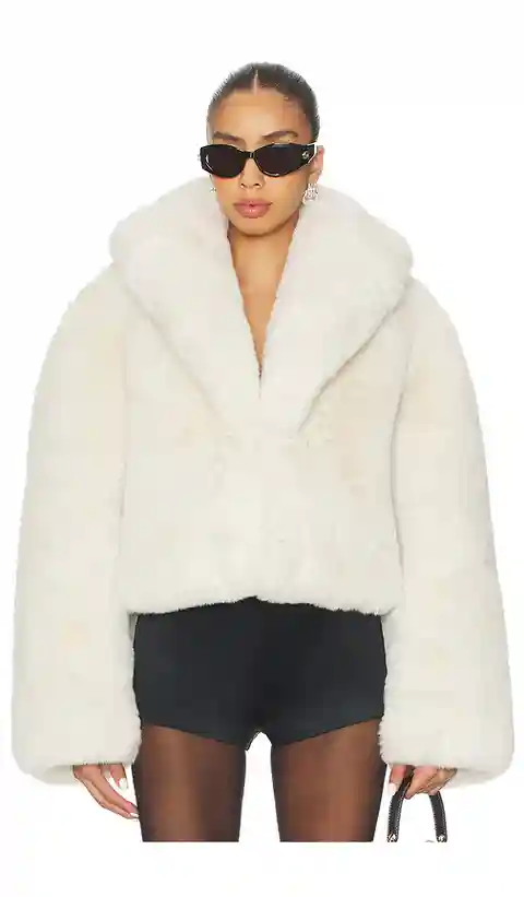 NBD Brooklyn Jacket in White. - size L (also in M, S, XL, XS, XXS) NBD Brooklyn Jacket in White. - size L (also in M, S, XL, XS, XXS) Faux fur: 100% polyester Lining: 97% polyester 3% elastane. Made in China. Dry clean only. Concealed hook closure. Cropped fit. Thick folded collar. Inner pockets. Qu...more