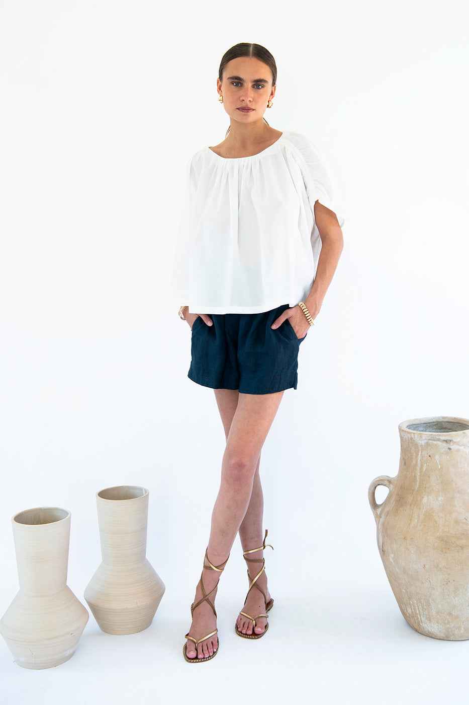 Introducing the Julietta Blouse in cotton poplin: a modern take on a timeless classic. With subtle yet striking ruching at the shoulders, this blouse effortlessly adds a touch of contemporary flair to its elegant silhouette. Crafted from 100% organic cotton, it not only looks good but feels good too...more