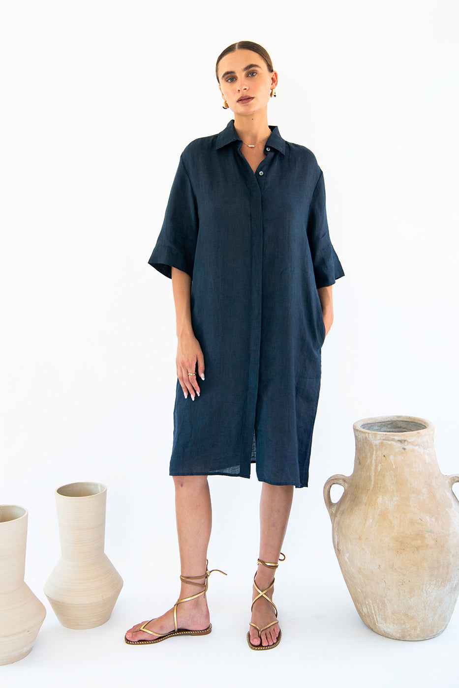 Designed for those who appreciate effortless style and comfort, this dress is a timeless addition to any wardrobe. Crafted from luxurious 100% linen, this shirt dress offers a lightweight and breathable feel, perfect for warm days or layering during cooler evenings. The button-front design exudes cl...more