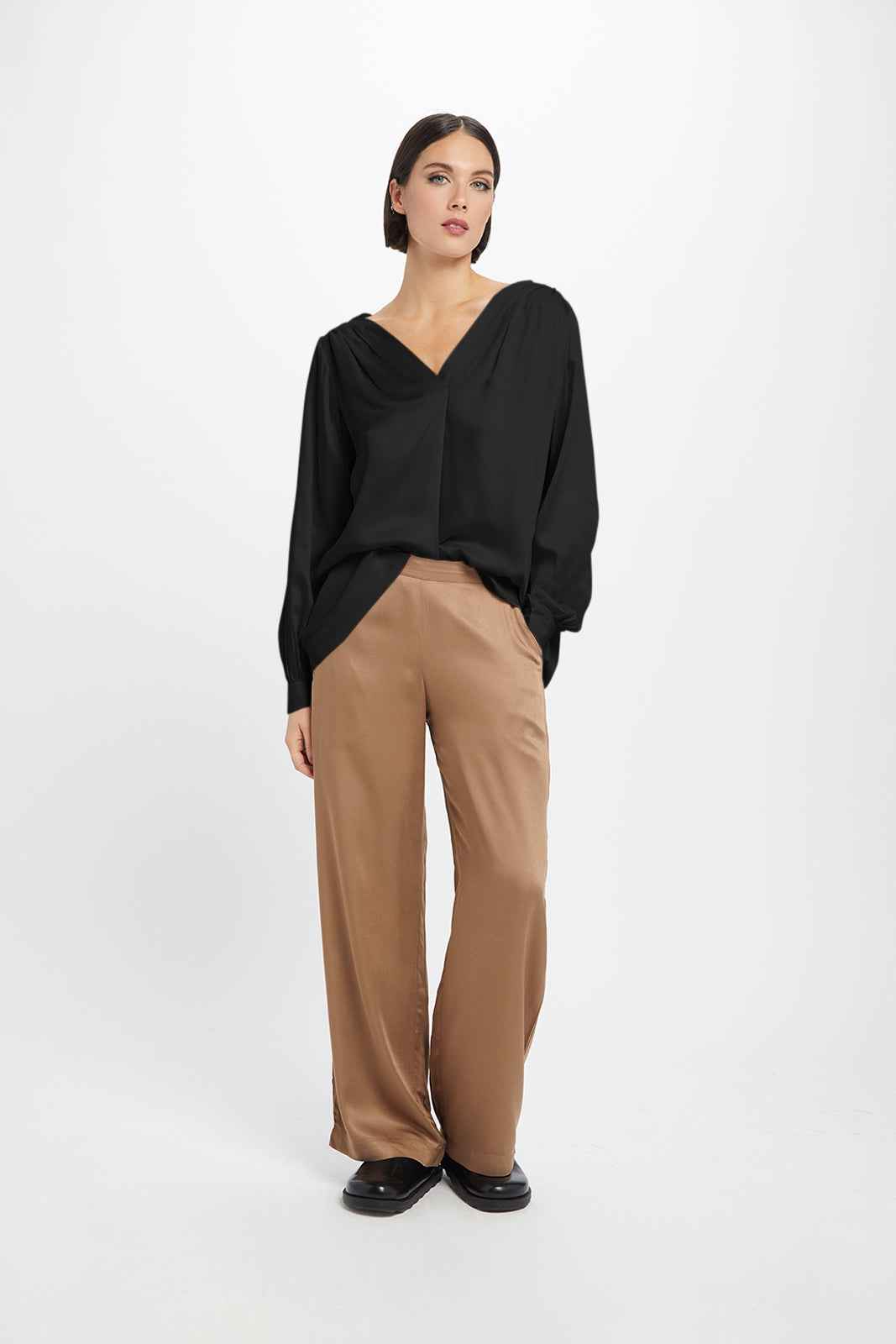 A sleek wardrobe staple, the Long Sleeve Gina Blouse is the perfect date night top. In our signature satin TENCEL and with a subtly relaxed shape, this versatile blouse is a perfect choice for any occasion. Pullover style with mother of pearl buttons at wrist, hits below the waist. Shown with the Ca...more