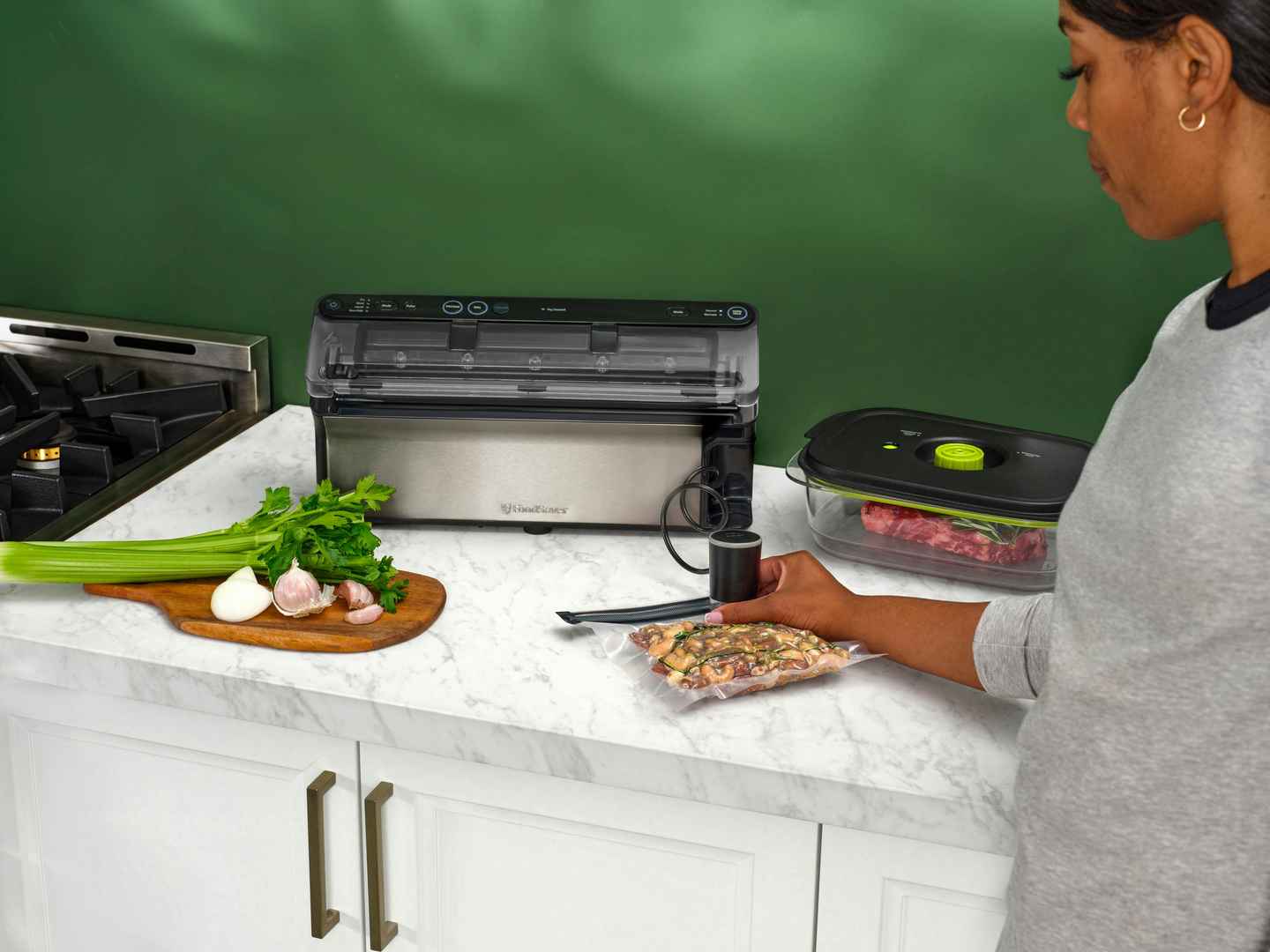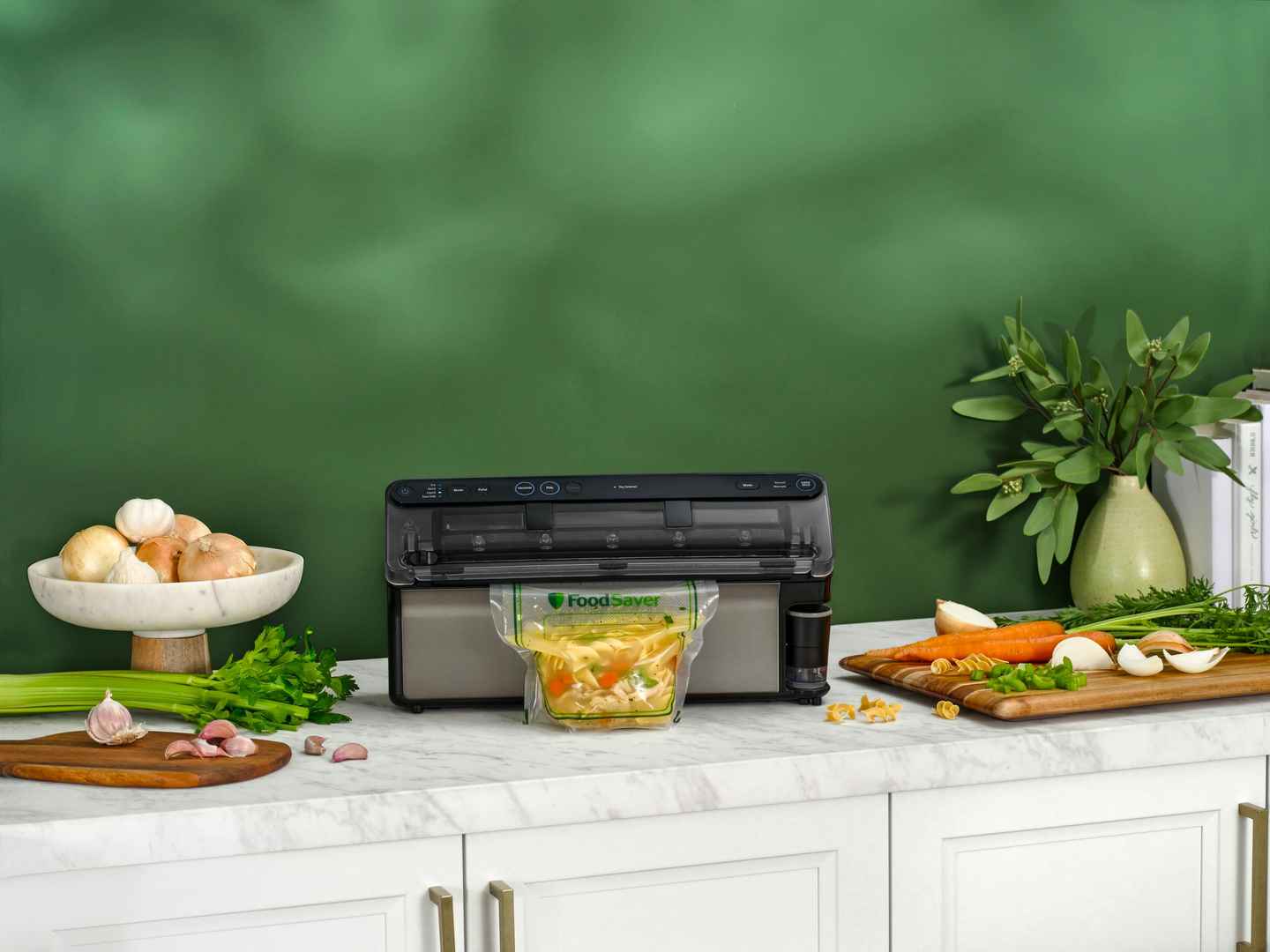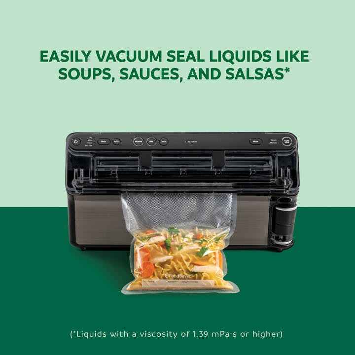 The FoodSaver Elite All-in-One Liquid+ with auto lock makes it easy to vacuum seal liquids like soups, sauces, and salsas,* plus proteins, produce and pantry staples, for unprecedented vacuum sealing performance. (*Liquids with a viscosity of 1.39 mPas or higher) | FoodSaver Elite All-in-One Liquid+...more