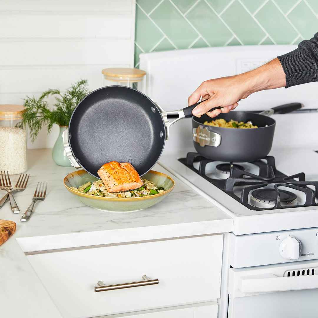 Featuring AquaShield nonstick technology that keeps pans performing like new 40% longer,* Select by Calphalon Hard-Anodized Cookware has an exceptionally smooth cooking surface, plus a space-saving design. (*vs. prior generation of Select by Calphalon) Select by Calphalon Space-Saving Hard-Anodized ...more