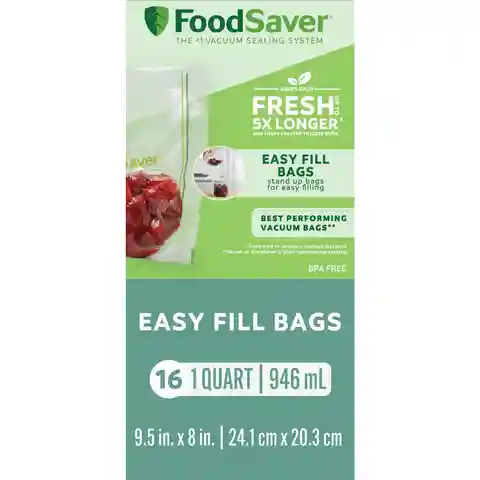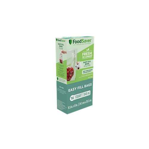 (16) QUART EASY FILL BAGS Keep food fresh with less mess with the FoodSaver Easy Fill Vacuum Sealer Bags. Thanks to its upright design and wide, rigid opening, you can easily load food into your bags with less effort and less spills! It offers the same protection from freezer burn, spoilage, and nut...more
