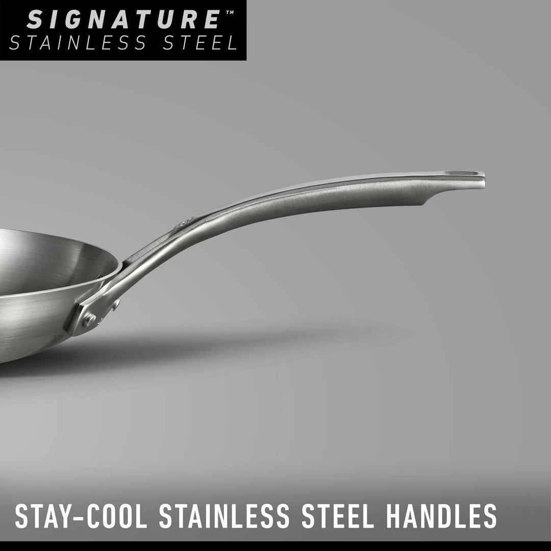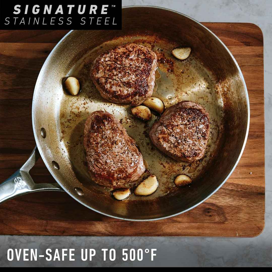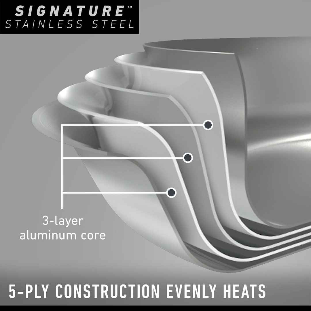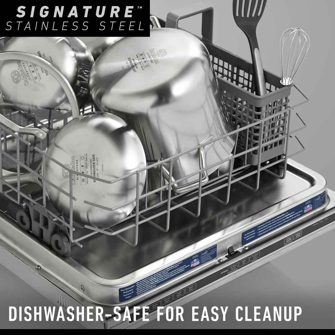 Calphalon Signature Stainless Steel Cookware features a 5-ply metal construction with a triple-layer aluminum core, for exceptional even heating and precise temperature control. Oven-safe up to 500 degrees F, and dishwasher-safe for easy cleaning. Signature Stainless Steel 10-Piece Cookware Set