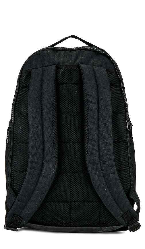 Nike Brasilia 9.5 in Black. Nike Brasilia 9.5 in Black. 100% poly. Made in Indonesia. Two-way top zip closure. Front fleece-lined zip pocket and slip pocket with Swoosh logo. Front compartment with mesh zip pocket. Back compartment with padded laptop sleeve and 3 slip pockets. Side mesh pockets Adju...more