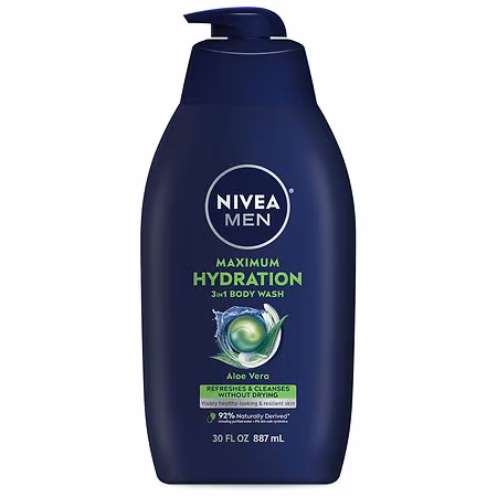 One 30 fluid ounce bottle of NIVEA MEN Maximum Hydration Body Wash with Aloe Vera The 3-in-1 formula can be used as a body wash, face wash and shampoo Body wash for dry skin provides nourishing moisture and long-lasting hydration, leaving skin visibly healthy-looking and resilient Men's body wash fe...more