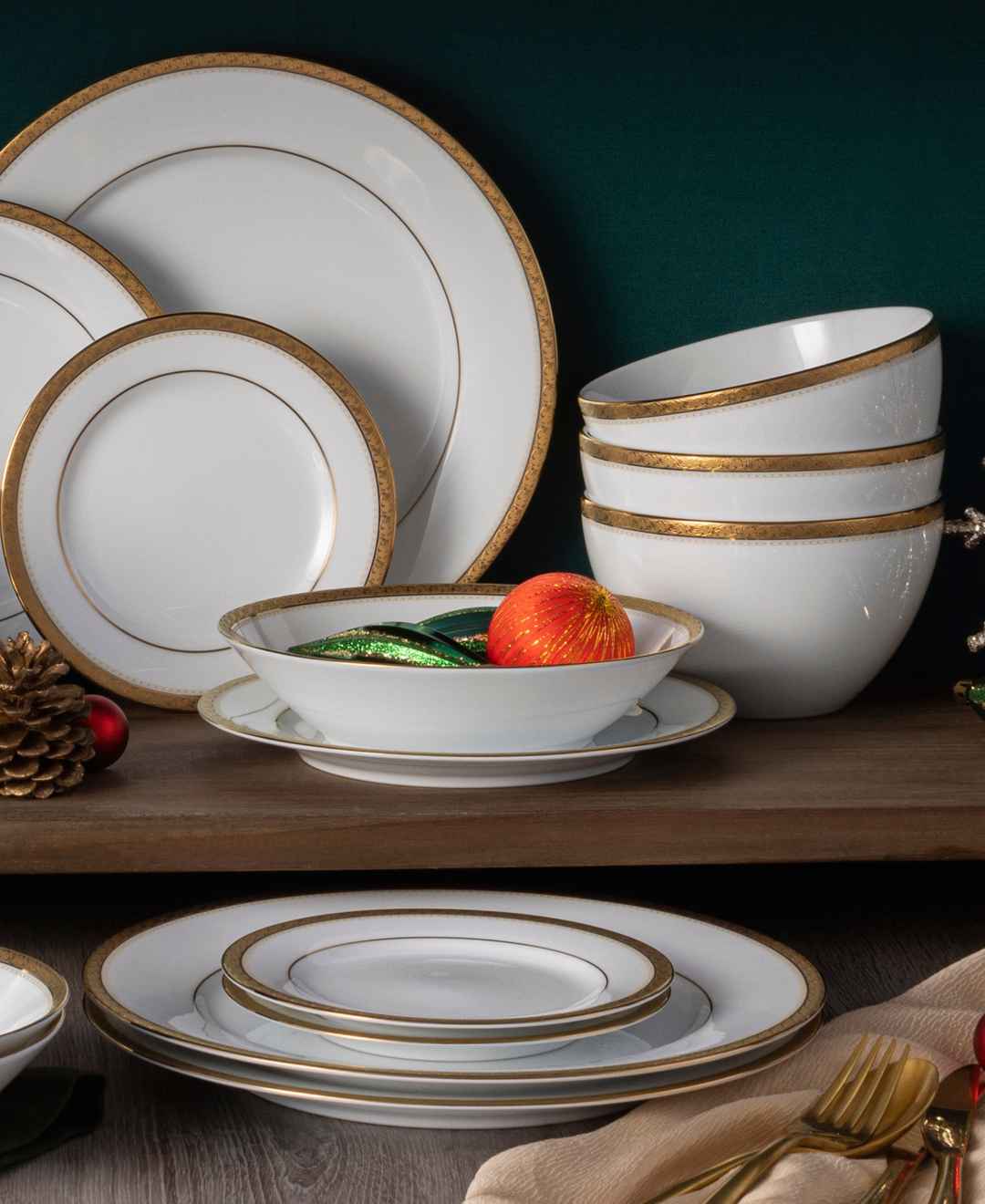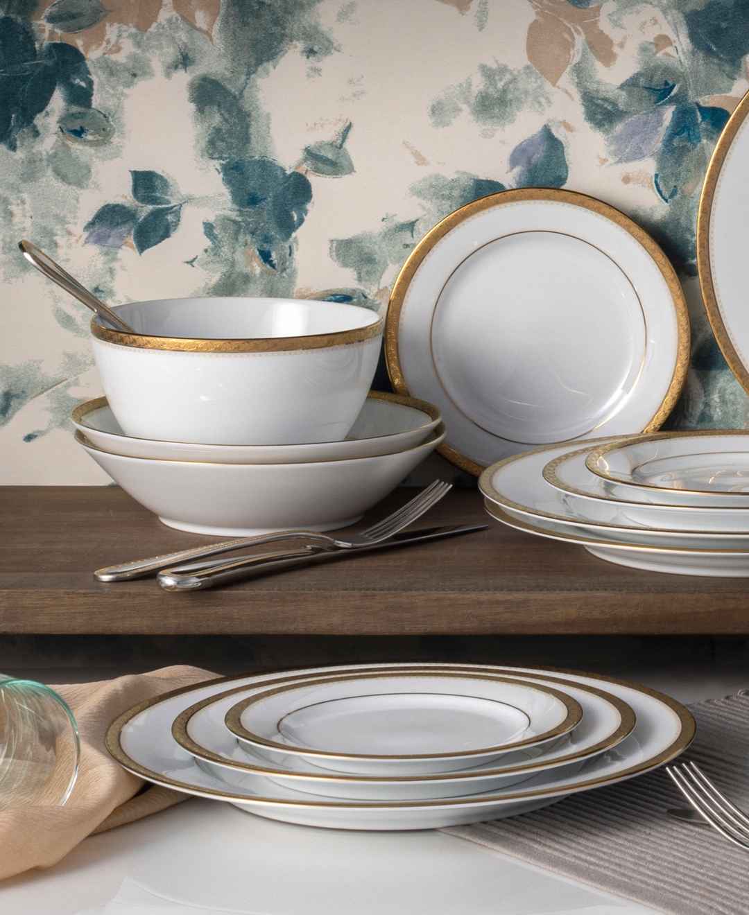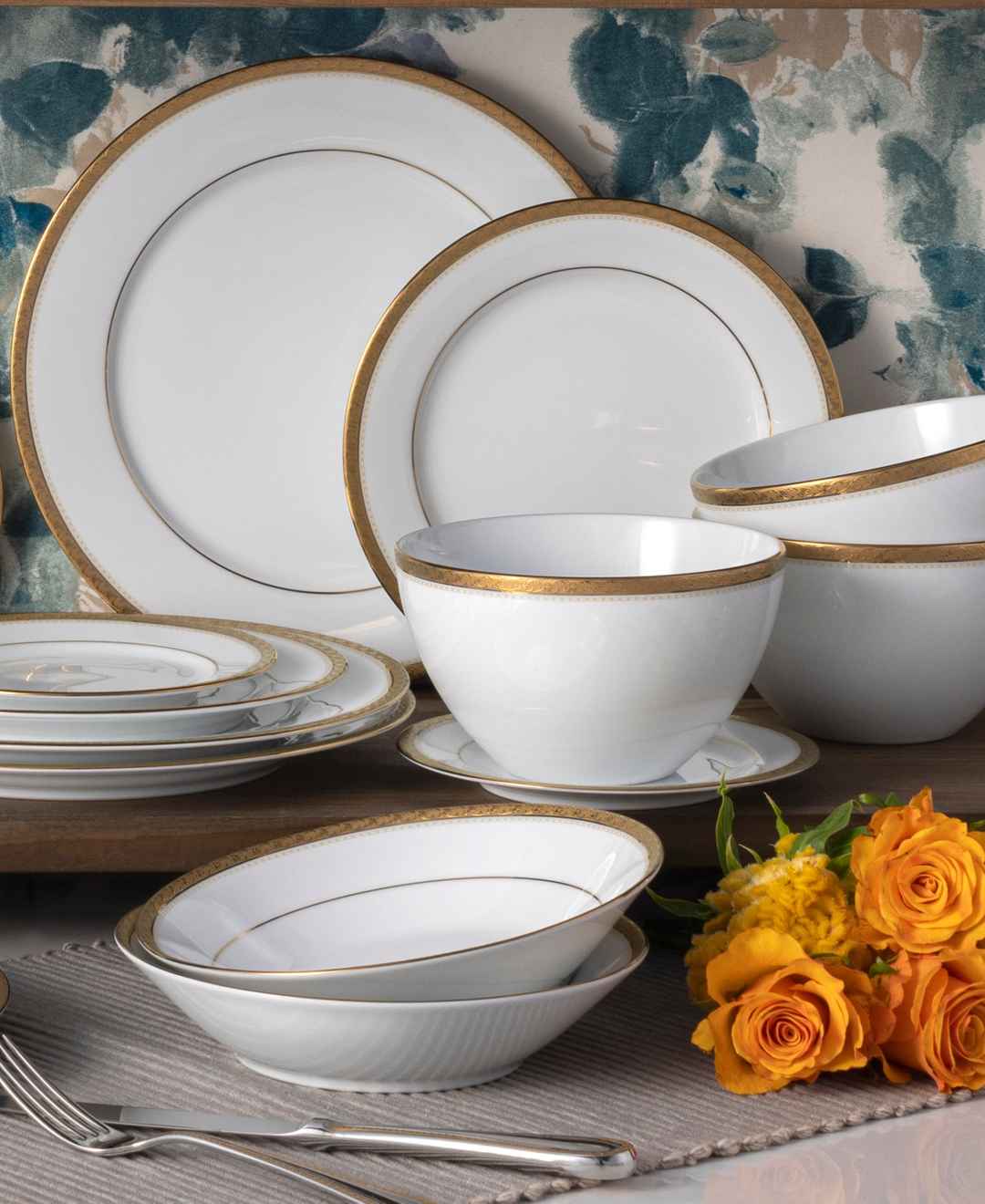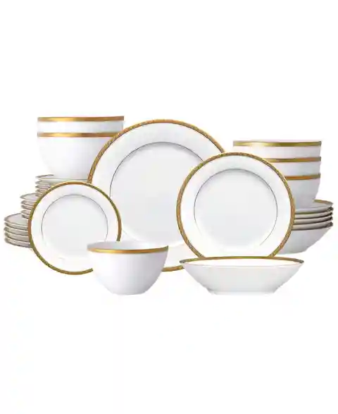 This Noritake Charlotta dinnerware set is rooted in classic elegance. Featuring prominent gold banding adorned with flowers and scrolling leaves, it's suitable for elegant dinners while remaining versatile enough for daily use.