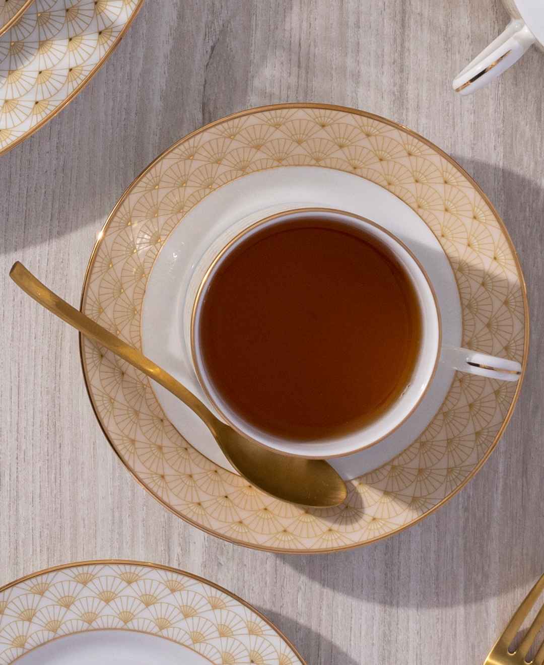 Designed for graceful sipping, this Noritake Trocadero Gold cup set highlights geometric fan motifs that lend an artistic character. Porcelain with banding details deliver durability, while enhancing every coffee or tea moment.