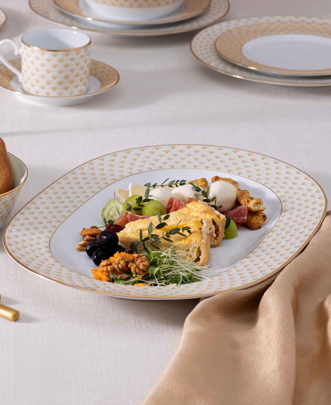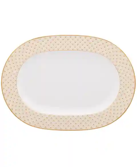 Commanding attention at the table, this Noritake Trocadero oval platter is crafted with an art deco fan motif that adds visual rhythm to presentations. A glimmering band enhances its refined appeal, while the durable construction supports confident daily use.