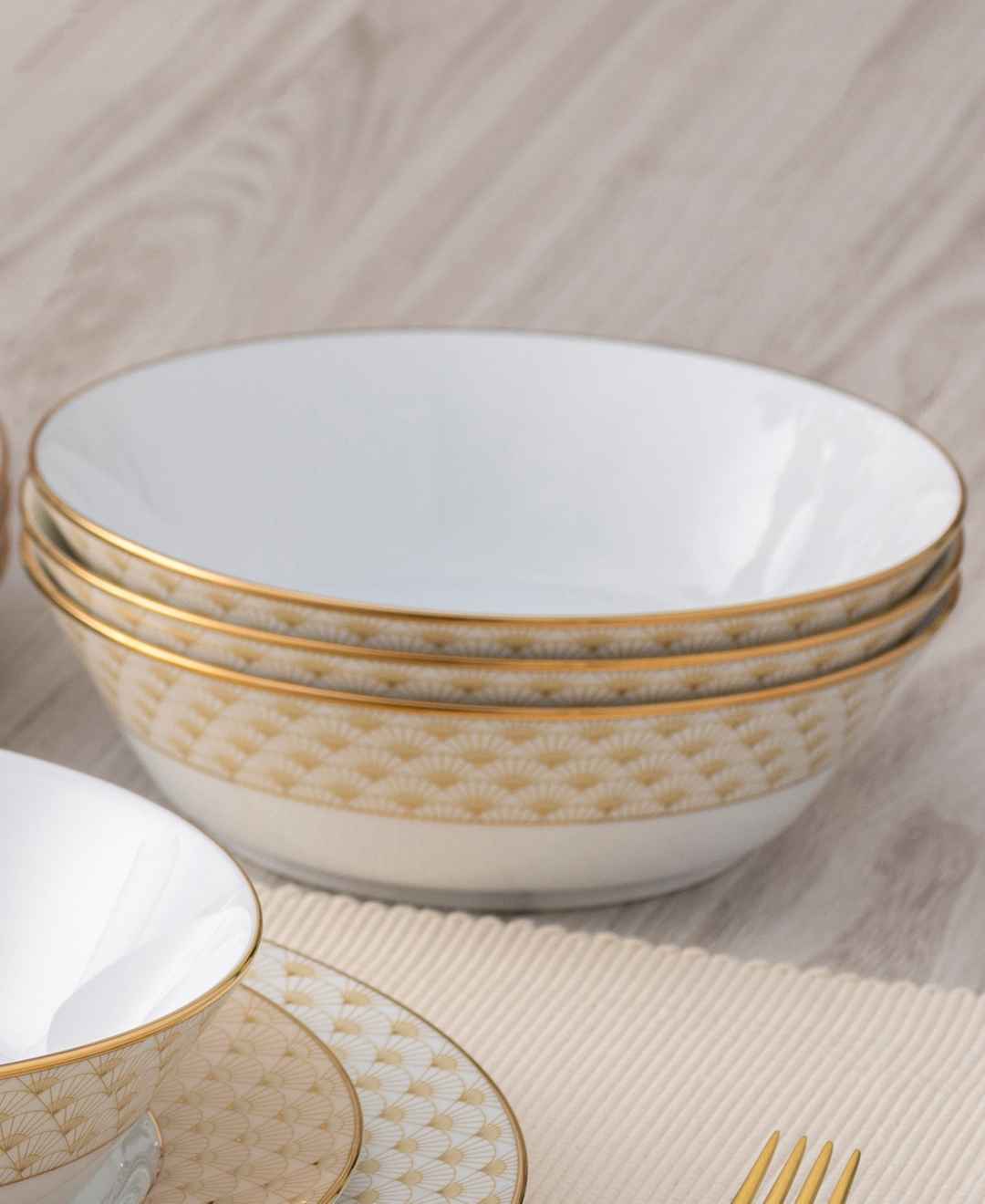 Designed for generous servings, this Noritake Trocadero soup bowls set showcases architectural art deco motifs for visual depth. Durable and gold detailing provide both resilience and elevated appeal.