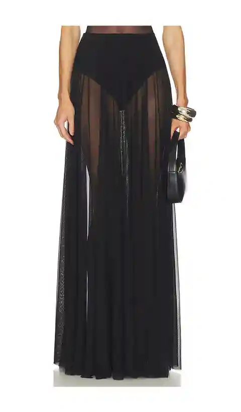 Norma Kamali Flared Skirt To Floor in Black. - size M (also in S, XS) Norma Kamali Flared Skirt To Floor in Black. - size M (also in S, XS) Self: 82% nylon 18% elastane Lining: 95% polyester 5% elastane. Made in China. Machine wash cold. Partially lined. Pull-on styling. Lightweight mesh fabric. sty...more