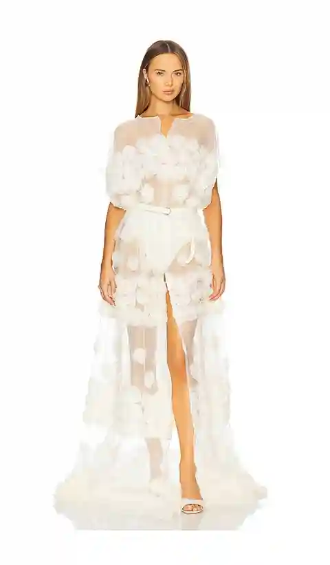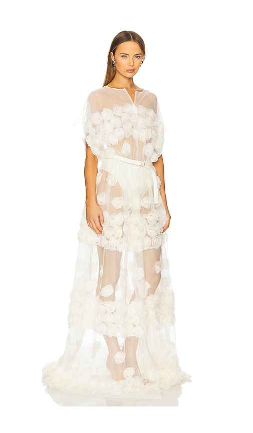 Norma Kamali Super OS Sleeveless BF Flared Gown in Cream. - size M (also in S) Norma Kamali Super OS Sleeveless BF Flared Gown in Cream. - size M (also in S) 100% polyester. Made in China. Hand wash only. Unlined. Pull-on styling with detachable belt. Chiffon fabric with rose accents. Garment is int...more