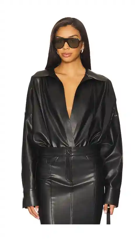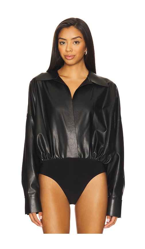 Norma Kamali Super Oversized Boyfriend NK Shirt Bodysuit in Black. - size L (also in M, S, XS) Norma Kamali Super Oversized Boyfriend NK Shirt Bodysuit in Black. - size L (also in M, S, XS) Self: 100% polyurethane Lining: 95% polyester 5% elastane. Machine wash. Bikini back with gusset snap closure ...more