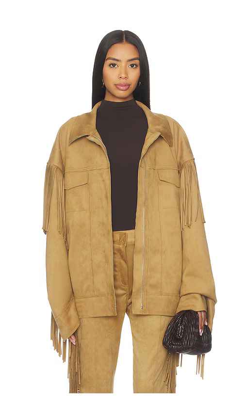 Norma Kamali Fringe Oversized Jean Jacket in Tan. - size XS (also in L, M, S) Norma Kamali Fringe Oversized Jean Jacket in Tan. - size XS (also in L, M, S) Self: 93% polyester, 7% elastane Combo: 95% polyester, 5% elastane. Made in China. Hand wash cold. Front zip closure. Midweight suede fabric. Fr...more