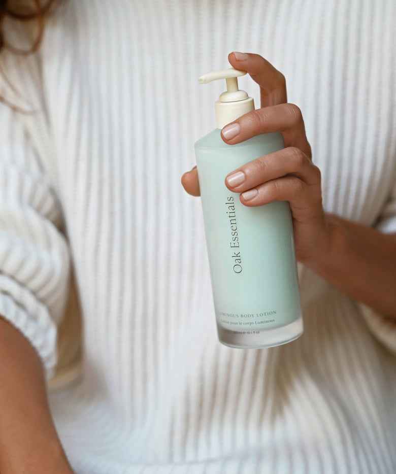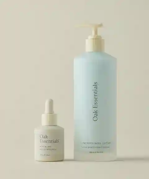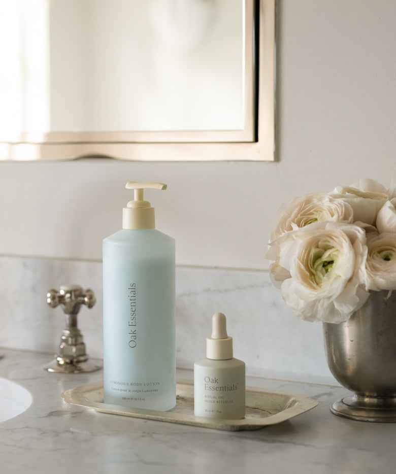 A pair of blue tansy-based hydrators for healthy, dewy skin from head to toe. Includes Ritual Oil and Luminous Body Lotion. | Oak Essentials Blue Tansy Bundle, Skin Care Set