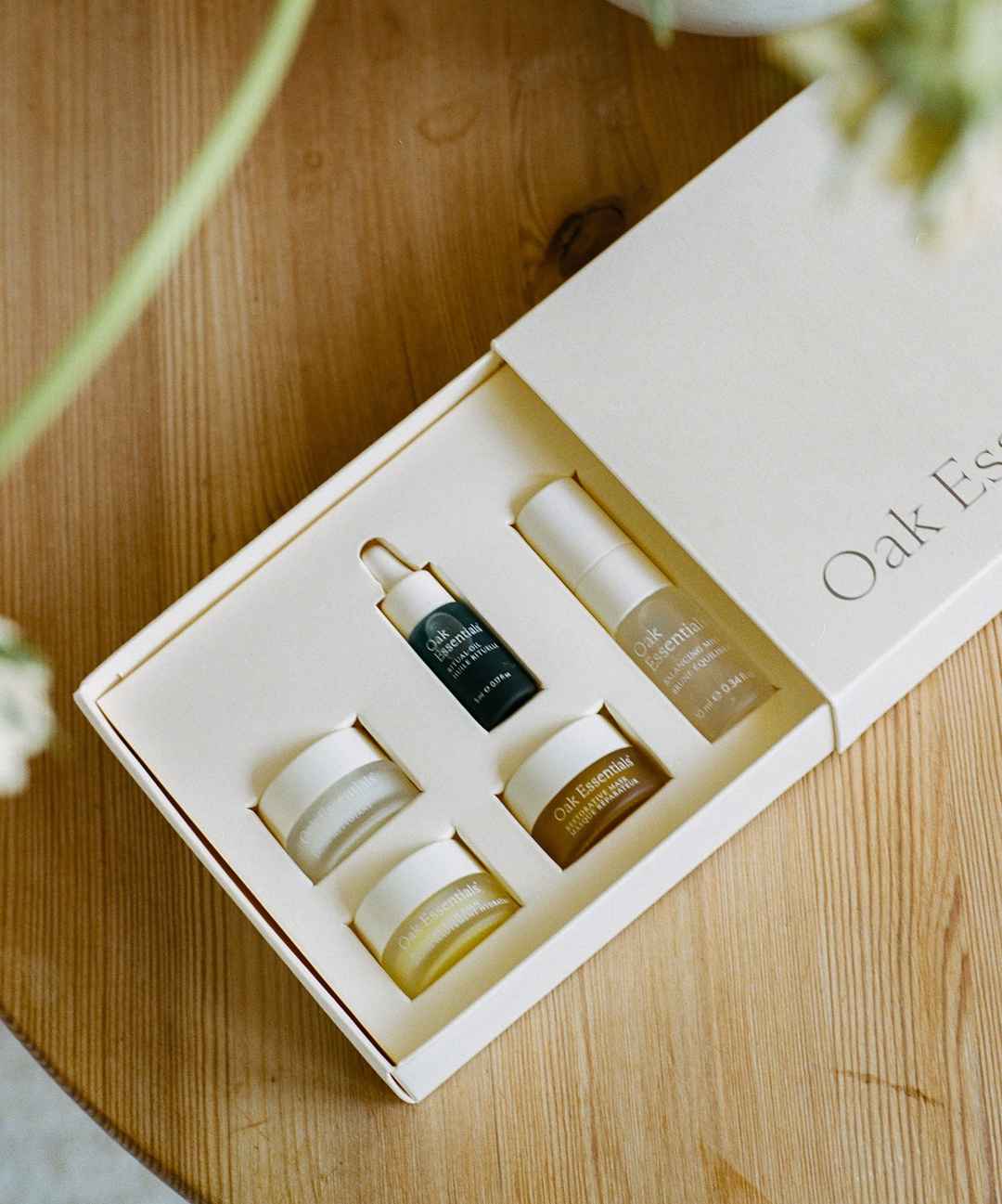 Our five best sellers in a simple, mini start-to-finish routine. Cleansing Balm, Balancing Mist, Ritual Oil, Moisture Rich Balm & Restorative Mask. | Oak Essentials Mini Routine, Skin Care Set