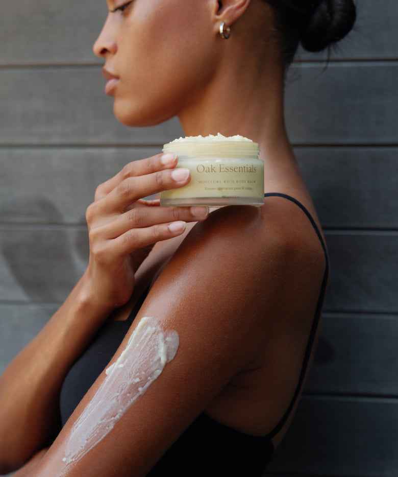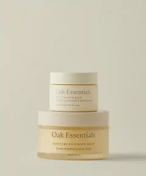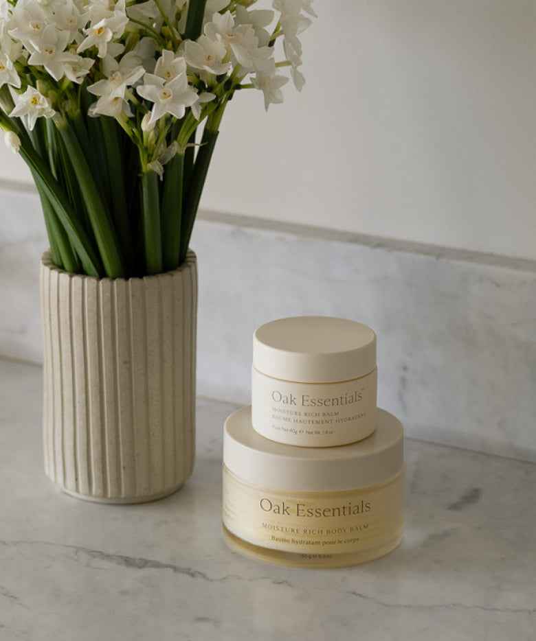 A mega-moisturizing duo to lock in hydration for a lasting head-to-toe glow. Moisture Rich Balm & Moisture Rich Body Balm. | Oak Essentials Moisture Rich Duo, Skin Care Set