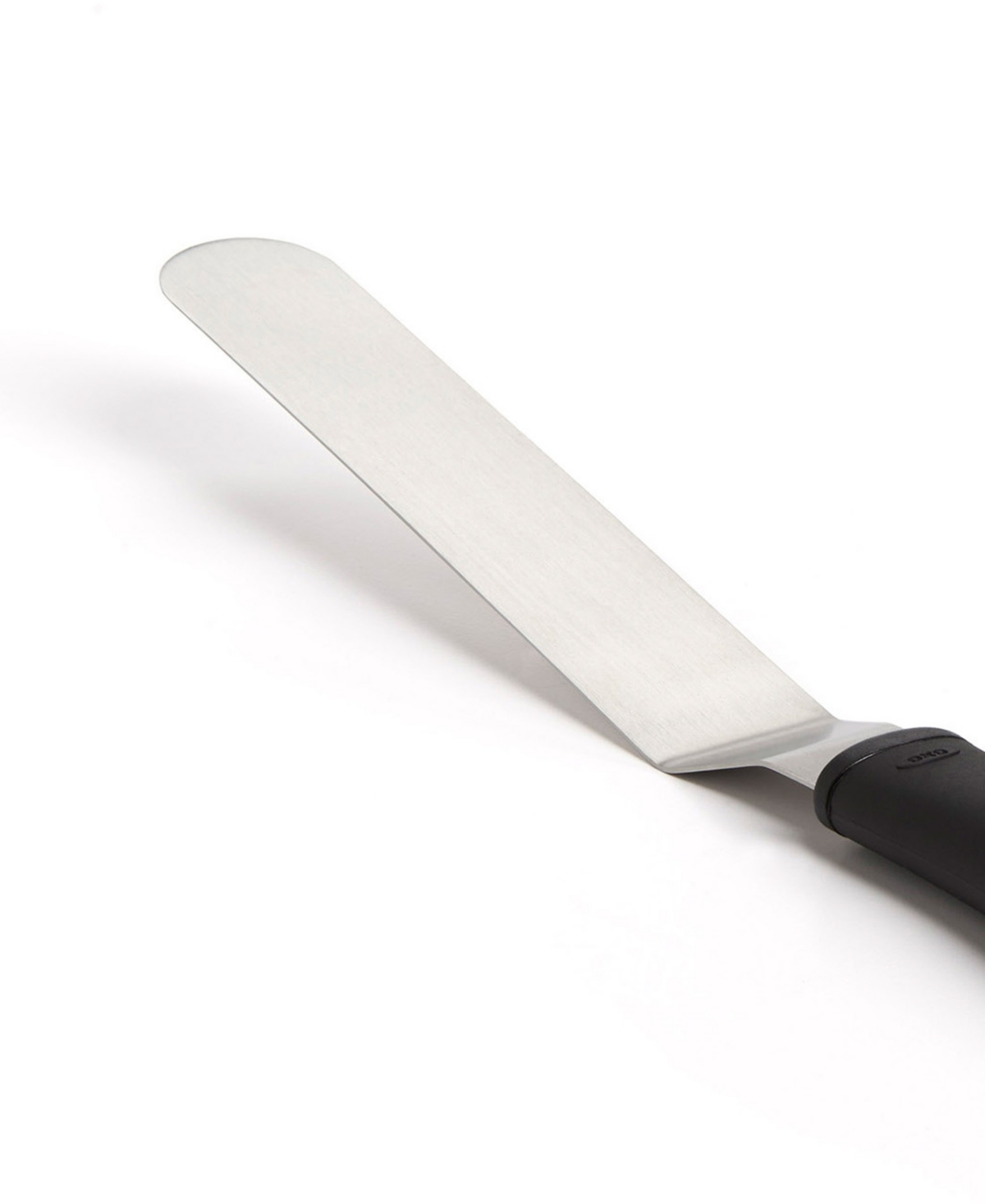 Finish desserts with professional polish using this Oxo Good Grips bent icing knife, featuring a wide, flexible blade for smooth spreading. An angled handle improves control and keeps surfaces clean.
