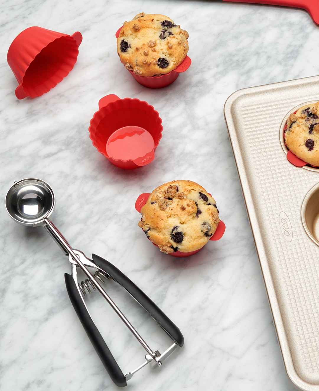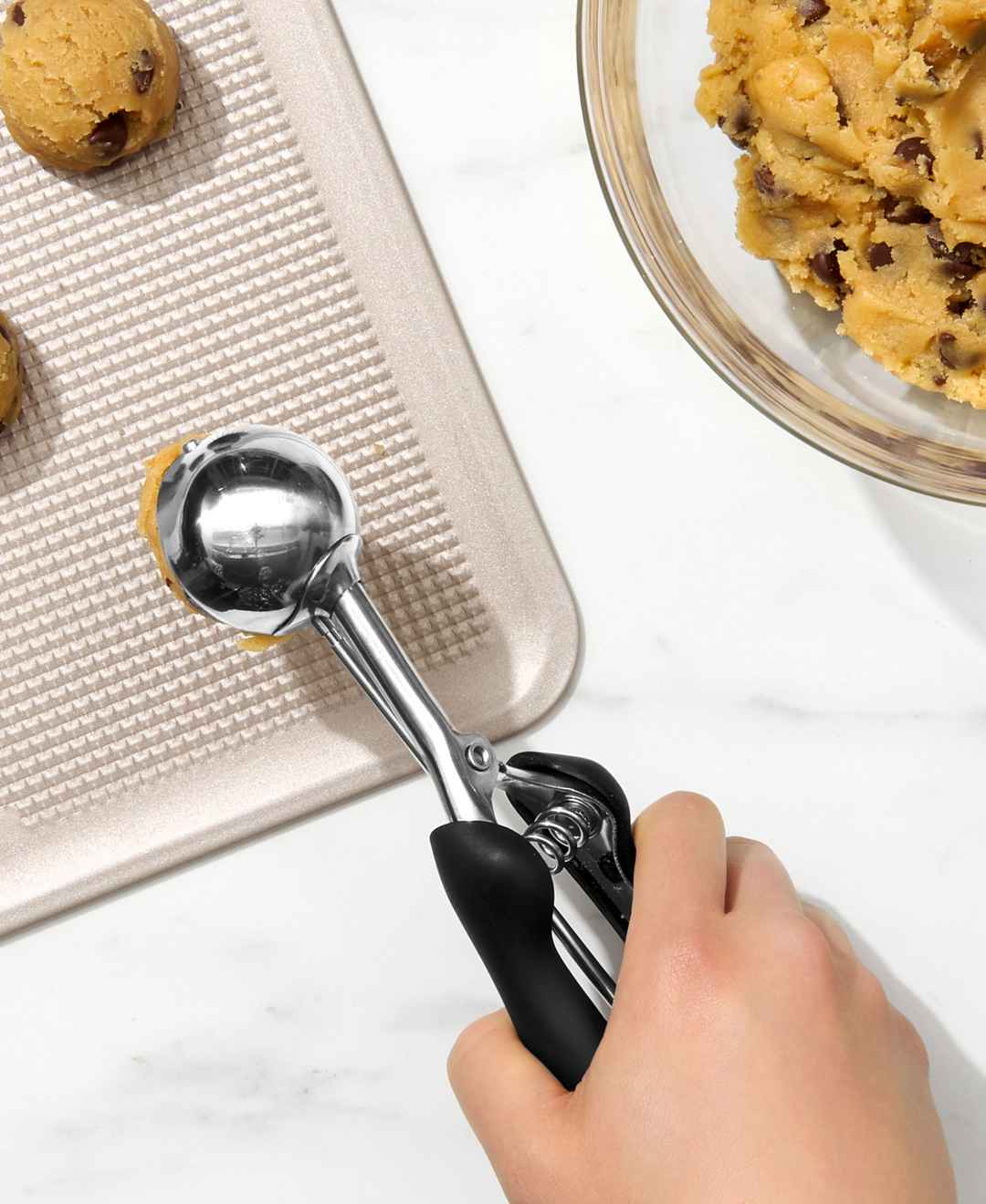 Keep your cookies perfect proportioned with this scoop from Oxo. Sturdy stainless steel can handle any dough, soft or tough, while a wiper inside the scoop helps eject even the stickiest mix.
