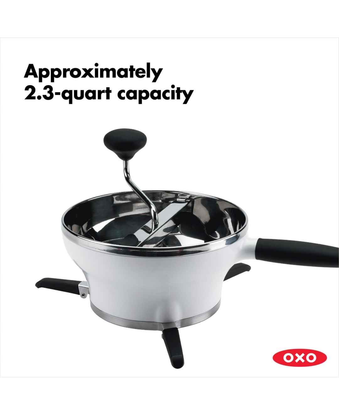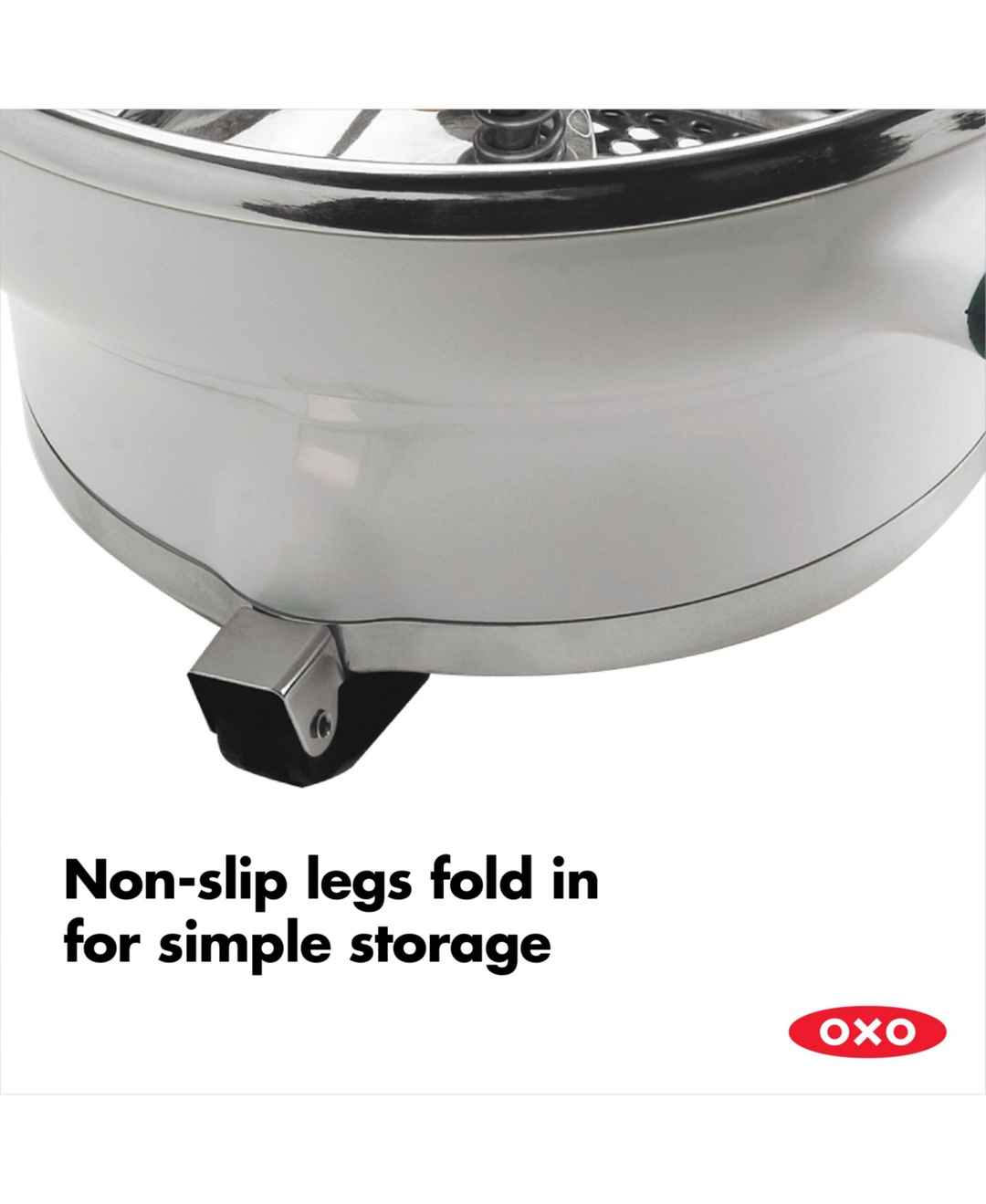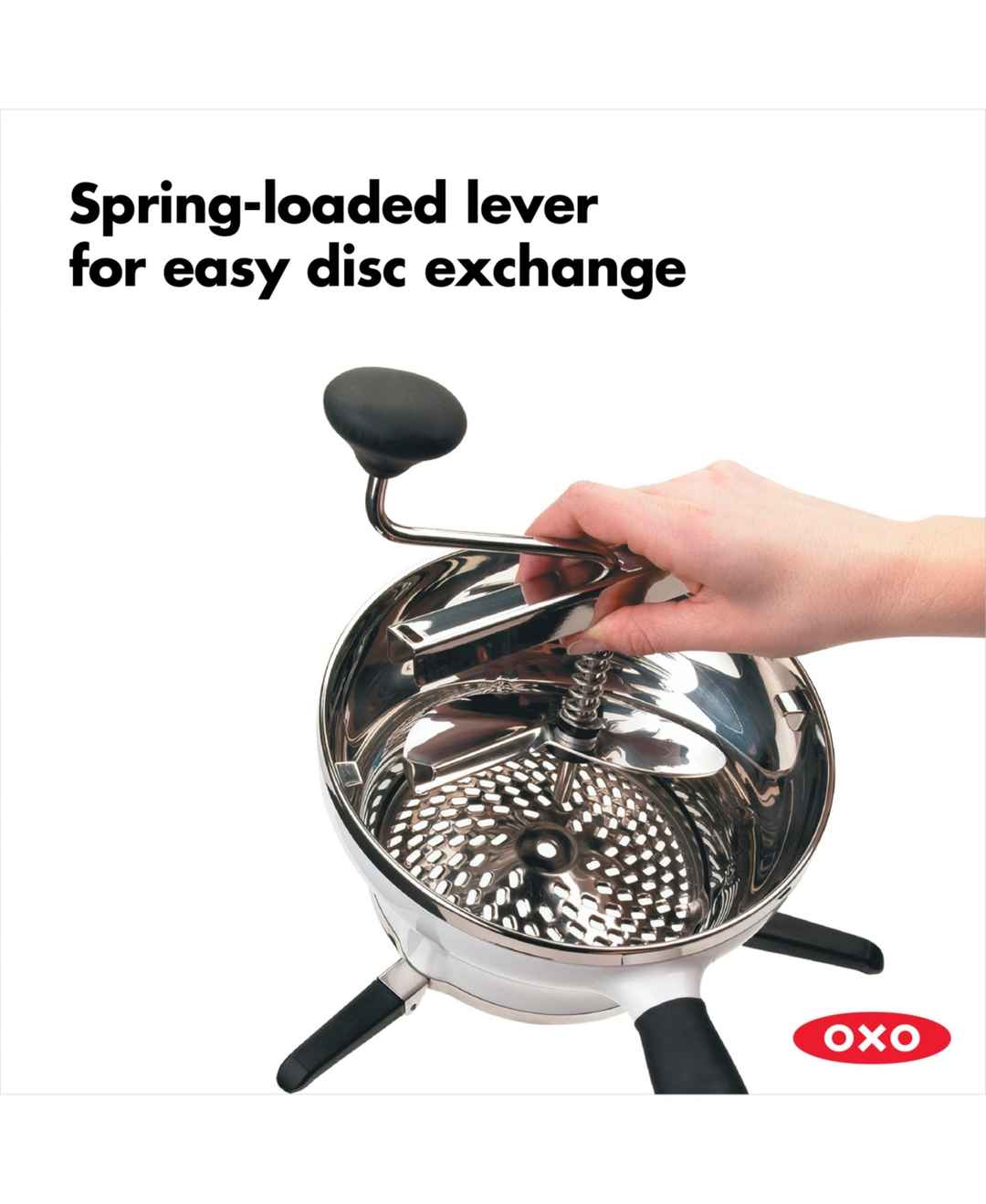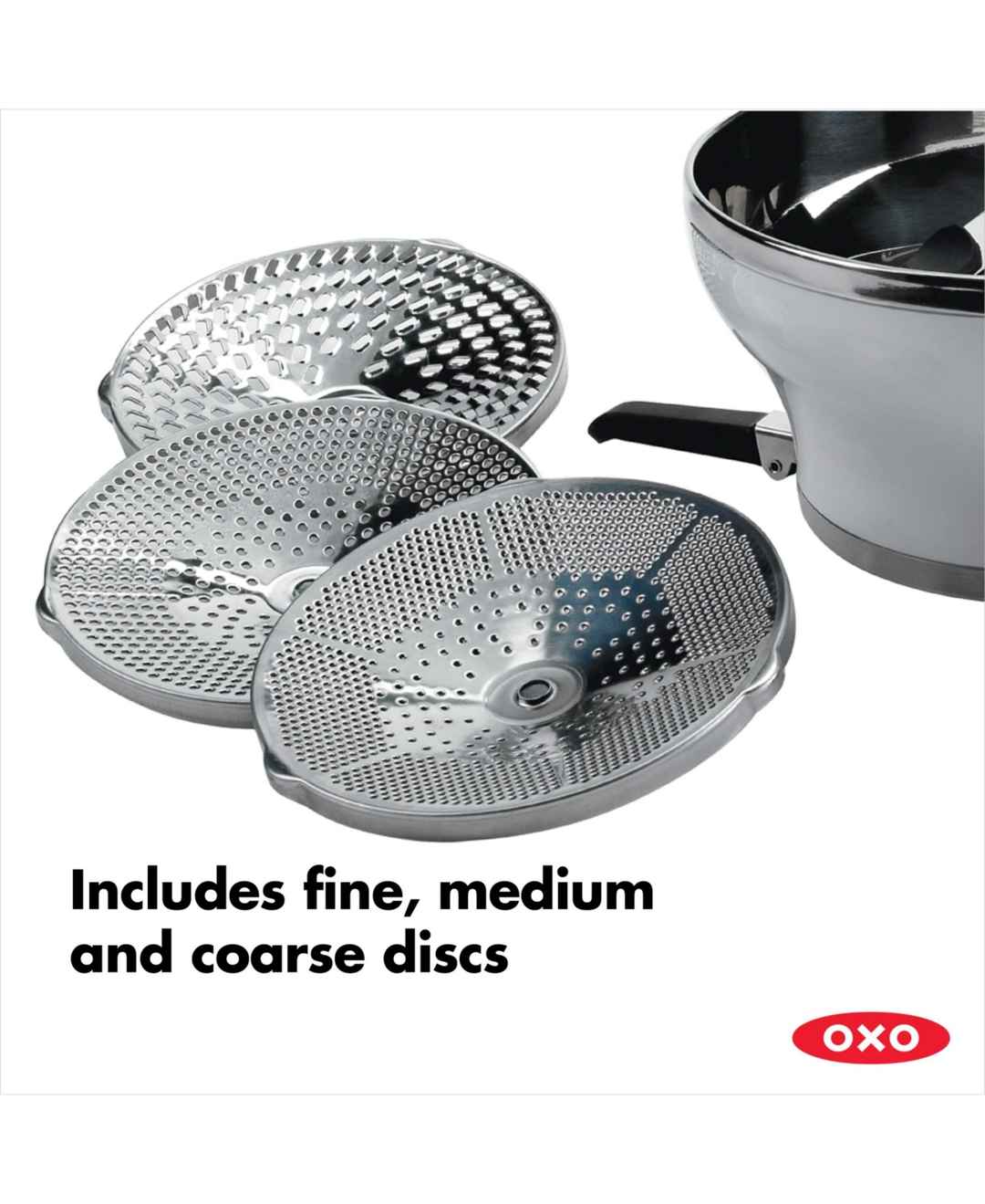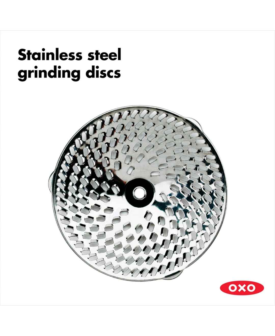 Whether you're preparing hot or cold foods, the stainless steel inner bowl helps preserve temperature and won't stain. Includes three grinding discs for fine, medium and coarse textures. Unique release button makes it easy to exchange discs and disassemble. Legs fold for easy storage