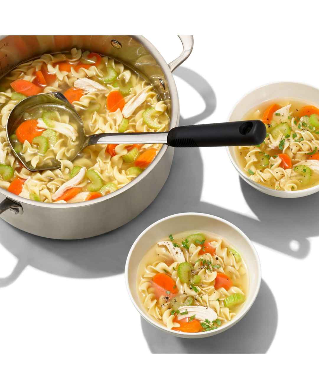 Scooping and pouring hearty sauces and gravy doesn't have to make a mess. We designed the Good Grips Stainless Steel Ladle to let you serve soups, stews and more without worrying about run-off or drips ruining your tablecloth. Pouring spouts on both sides of the ladle make it easy for both right- an...more