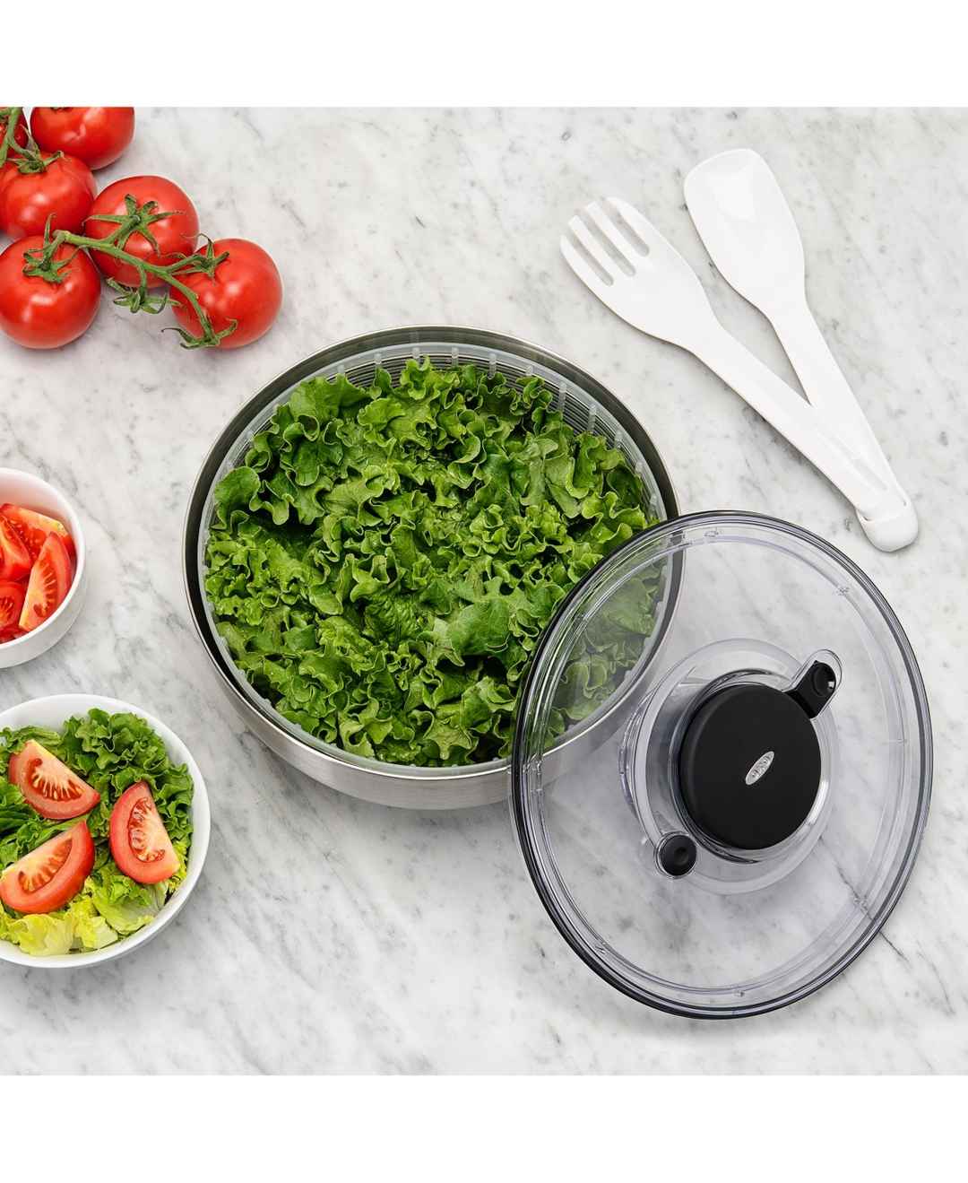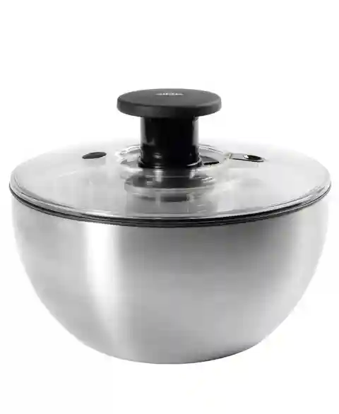 An elegant twist on our classic spinner. Dry salad greens with a simple press of the soft, non-slip knob. The non-slip base keeps the bowl steady on the countertop and the built-in brake button stops the Salad Spinner for unloading. The stainless steel bowl is perfect for serving salad, and the bask...more