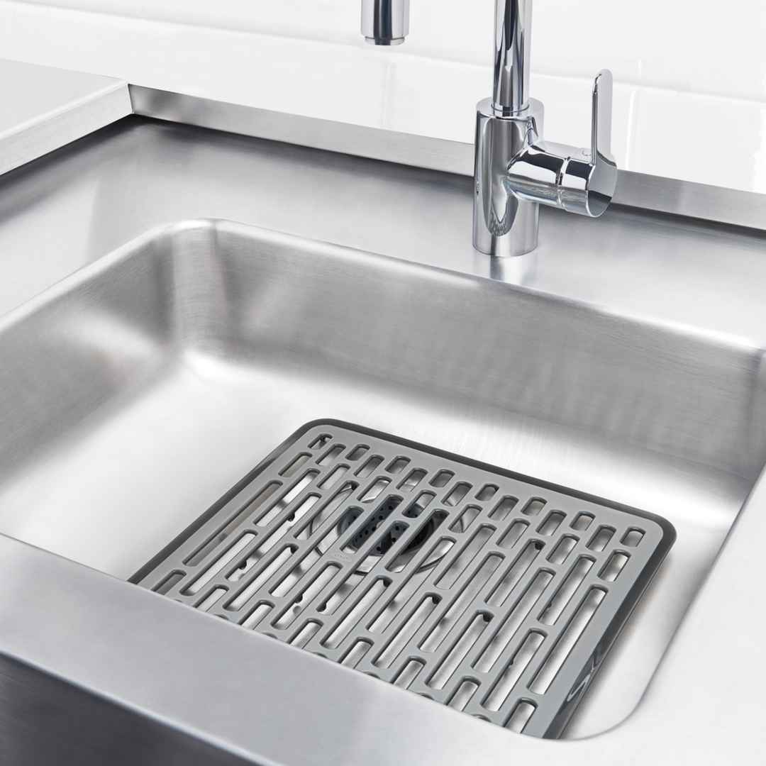 Silicone surface provides cushion to protect sink surfaces and dishware from chipping and scratching. Rigid Mat with non-slip silicone feet stays securely at bottom of sink. Feet elevate Mat for water flow and quick drying.